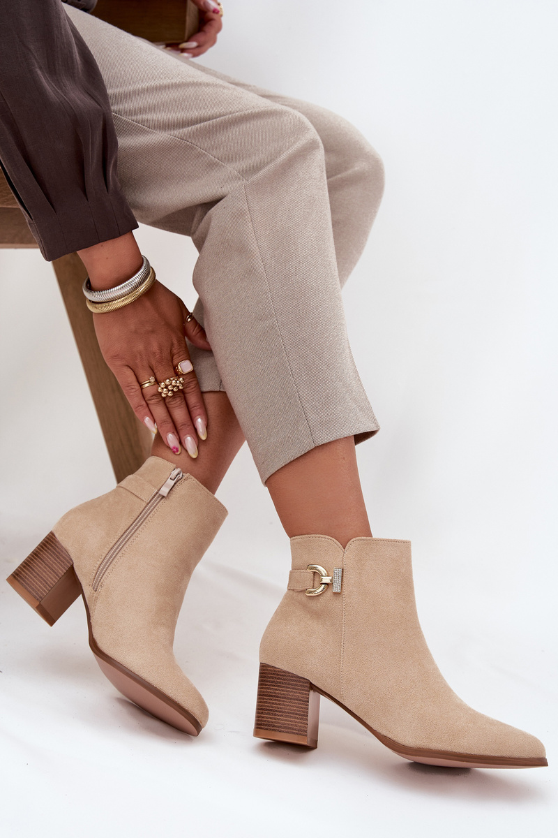 Zateplené dámské kotníkové boty na podpatku se zlatým detailem béžové Renora
