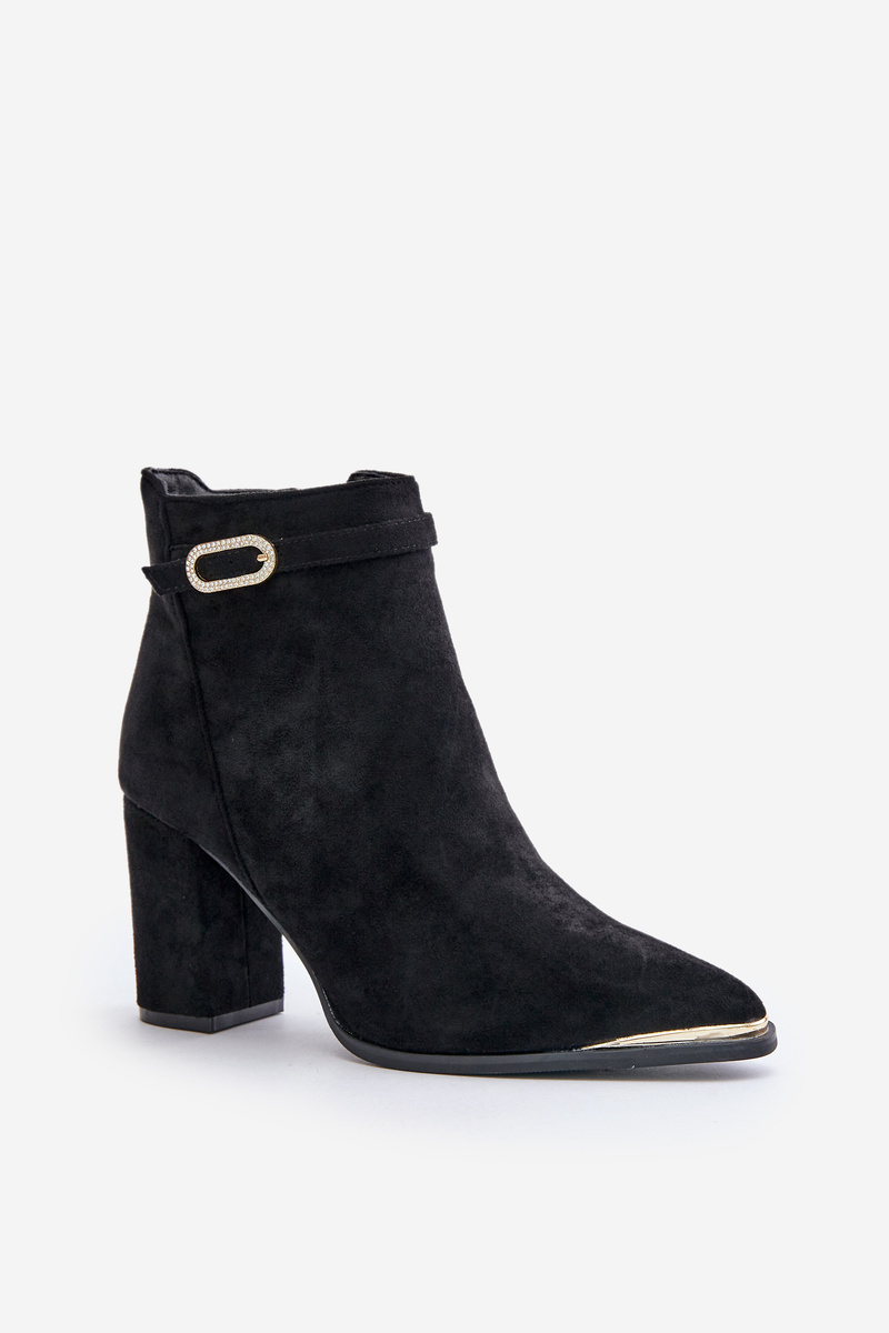 Dámské botky vyrobené z příjemného eko semiše. Uloženy na sloupkovém podpatku. Zapínání na zip. Špičky ve tvaru špičky opticky prodlouží nohy. Pevný opatek zvyšuje stabilizaci nohy. Vnitřek vyhřívaný obuvnickou vlnou zajistí teplo v chladnějších dnech. Tento model se vyznačuje zlatými prvky, které dodávají eleganci! Při výběru velikosti se řiďte tabulkou velikostí.