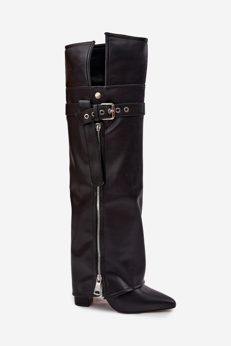 Zateplené dámské kozačky nad koleno na sloupku s páskem sponou a stříbrným zipem Černé Reisa