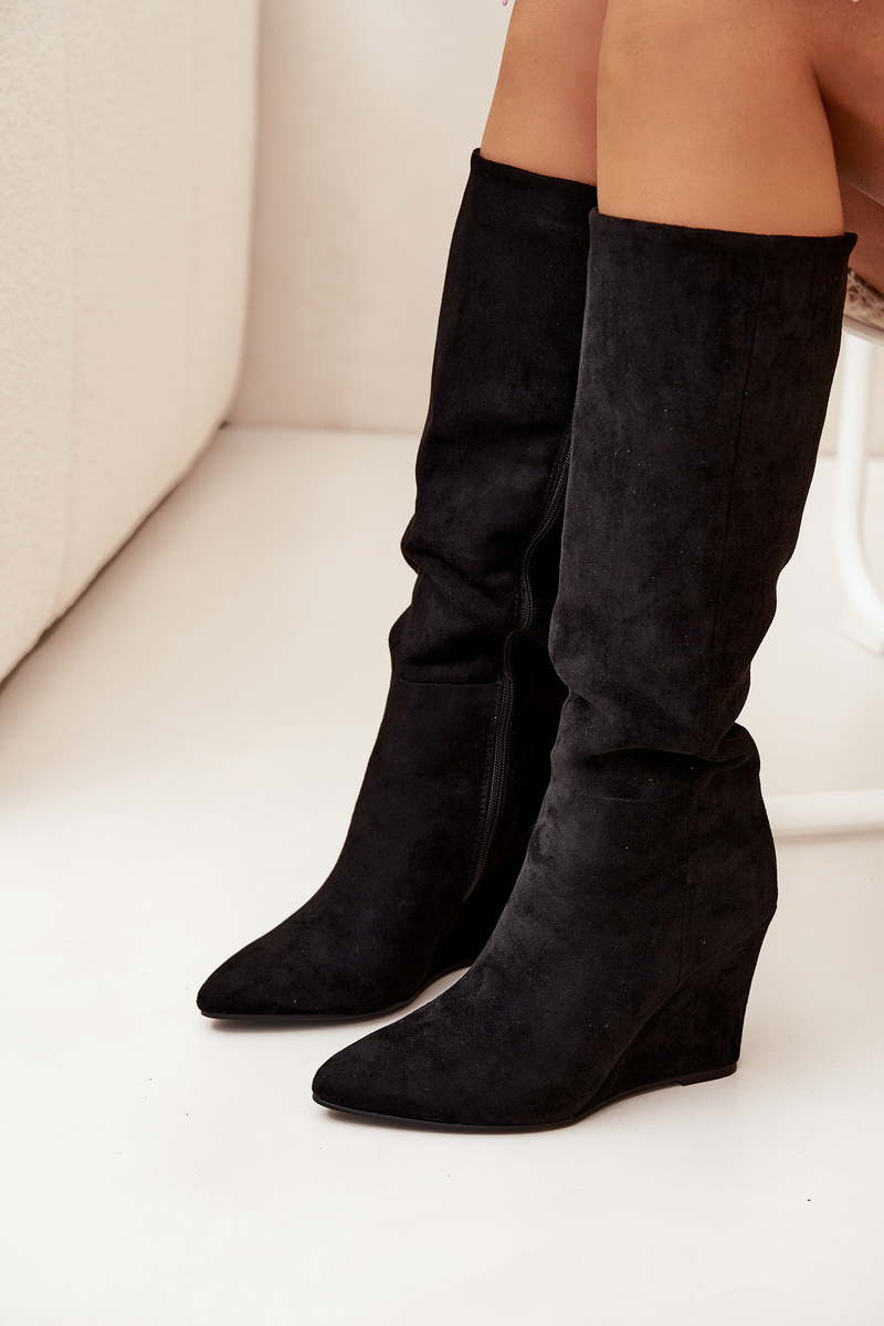 Dámské kozačky z eko semiše, umístěné na platformě, spojují eleganci s komfortem. Zapínají se na zip, což zajišťuje snadné obouvání, a zateplení obuvnickým fleecem zaručuje teplo v chladnějších dnech. Svršek sahající nad kolena jim dodává klasický vzhled a špičky v mandlovém tvaru přidávají jemnost. Ideální pro zimní styling, tyto kozačky se skvěle kombinují s šaty a sukněmi. Při výběru velikosti se řiďte tabulkou velikostí.