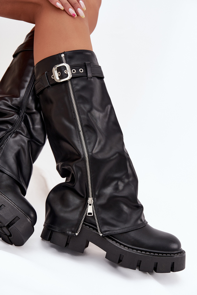Dámské kozačky s ohnutým vrškem jsou velkým hitem zimních trendů. Vyrobené z eko kůže. Postavené na platformě s mohutným podpatkem. Vyhřívané obuvním přikrývkou, zajišťují pohodlí a teplo v chladnějších dnech. Pohodlné na nošení díky zipu na boku, navíc stříbrný zip a pásek s přezkou na horní straně vršku dodávají módní, výrazný charakter. Skvěle se hodí jak pro každodenní, tak i pro elegantní stylizace. Při výběru velikosti se řiďte tabulkou velikostí. Při výběru velikosti se řiďte tabulkou velikostí.