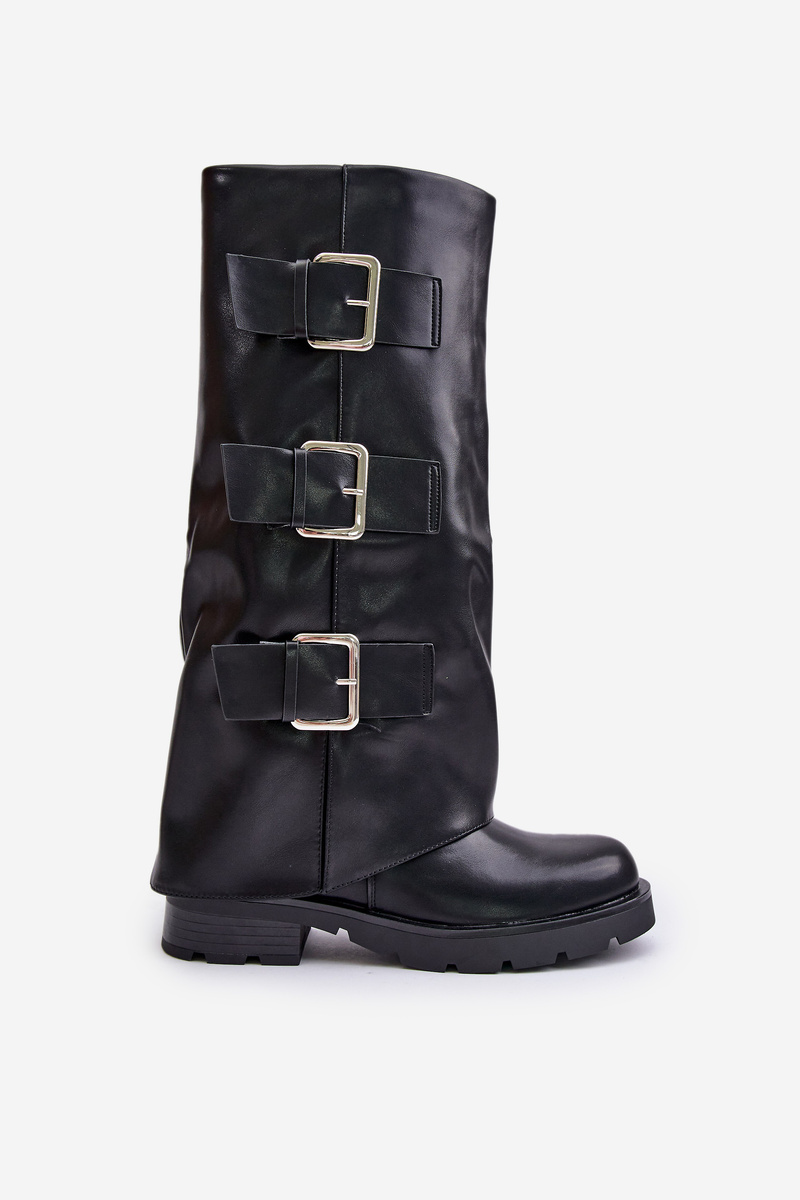 Zateplené kozačky s ohrnutým svrškem a přezkami černé Cialetta