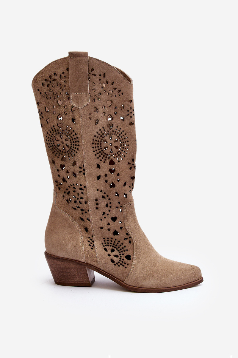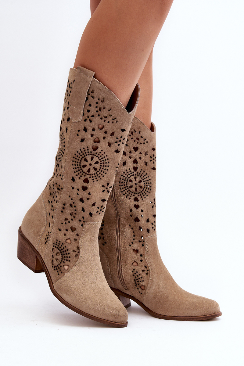 Polokozačky s ažurovaným svrškem po polovinu lýtka. Model v kovbojském stylu. Zapínají se na zip. Špičaté špičky opticky zjemňují nohy. Měkká kůží stélka zajistí pohodlí během nošení. Ažurované polokozačky jsou ideální volbou pro mnoho stylizací! Při výběru velikosti se řiďte tabulkou velikostí.