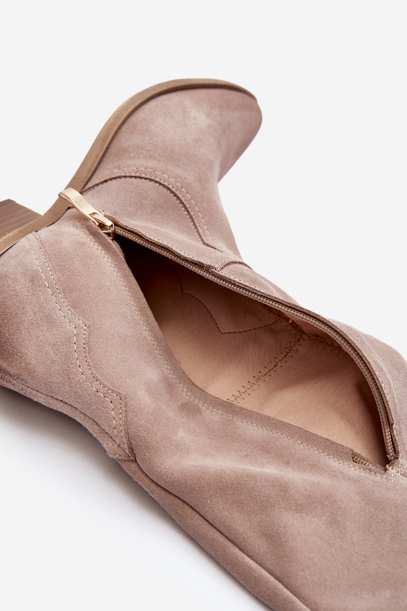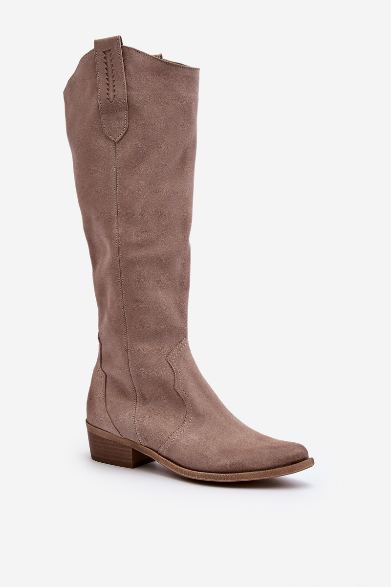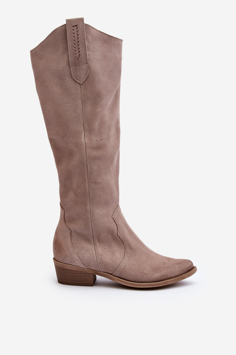 Dámské kozačky v kovbojském stylu jsou mimořádně moderní obuv na jarně-jižní sezónu. Vyrobena z přírodního semiše. Stabilní, nízký podpatek zajišťuje, že jsou pohodlné a ideální na nošení každý den. Model se zasouváním s dodatečným zapínáním na zip usnadňuje obutí bot. Svršek sahá před koleno. Kožená, měkká stélka zajistí pohodlí během nošení. Tyto kozačky skvěle ladí s různými stylizacemi. Určitě by měly být součástí vašeho šatníku! Při výběru velikosti se řiďte tabulkou velikostí.