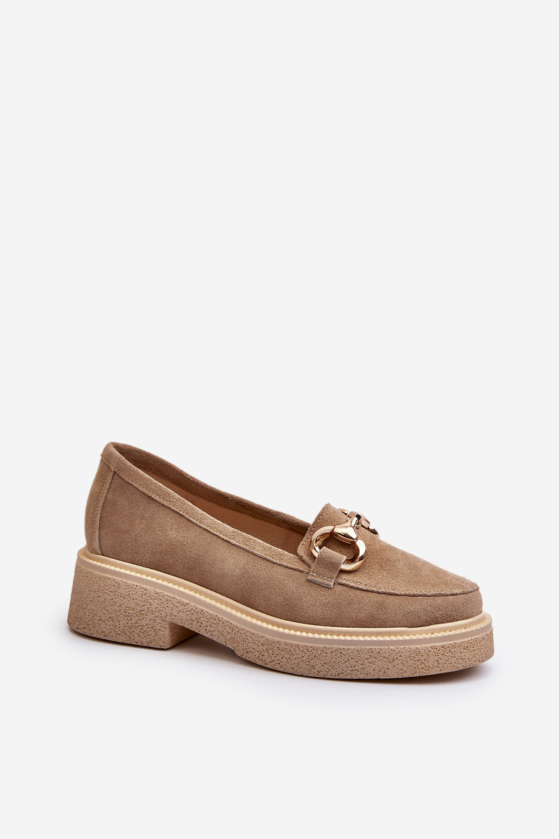 Tyto elegantní dámské mokasíny vyrobené z přírodního semiše nejsou pouze mimořádně stylové, ale také neuvěřitelně pohodlné. Jejich přední část je zdobená zlatým ozdobem, který jim dodává nádech luxusu a elegance. Umístěné na platformě a ploché podrážce. Profilovaná vložka zajistí pohodlí během nošení. Velmi módní střih, který můžete využít k mnoha stylizacím! Při výběru velikosti se řiďte tabulkou velikostí.