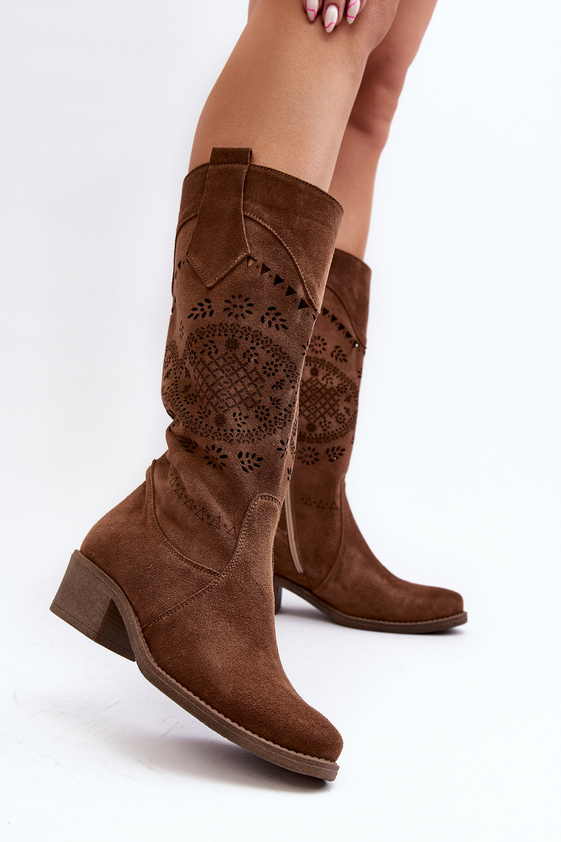 Dámské ažurové kozačky skvěle doplní jarní outfit. Vyrobené z přírodní semišové kůže. Nízký podpatek. Svršek po půlce lýtek je zapínán na zip. Špičaté nosky. Měkká stélka zajistí pohodlí během nošení. Při výběru velikosti se řiďte tabulkou velikostí.