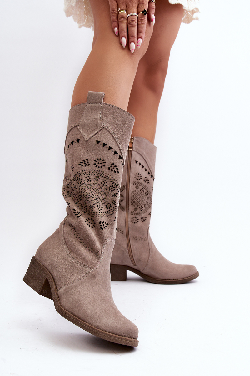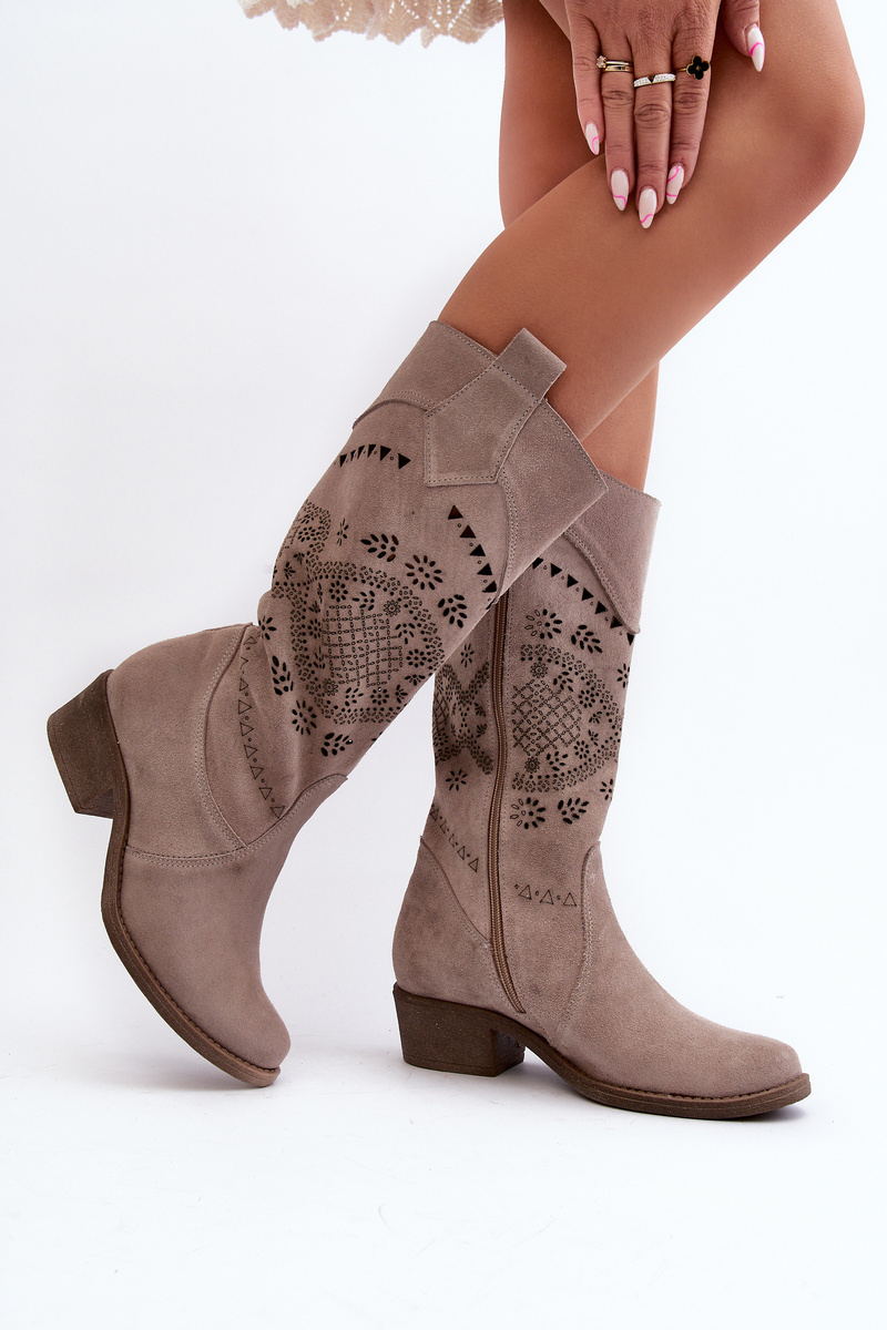 Zazoo 4043 Semišové kozačky na nízkém podpatku s výšivkou cappucino
