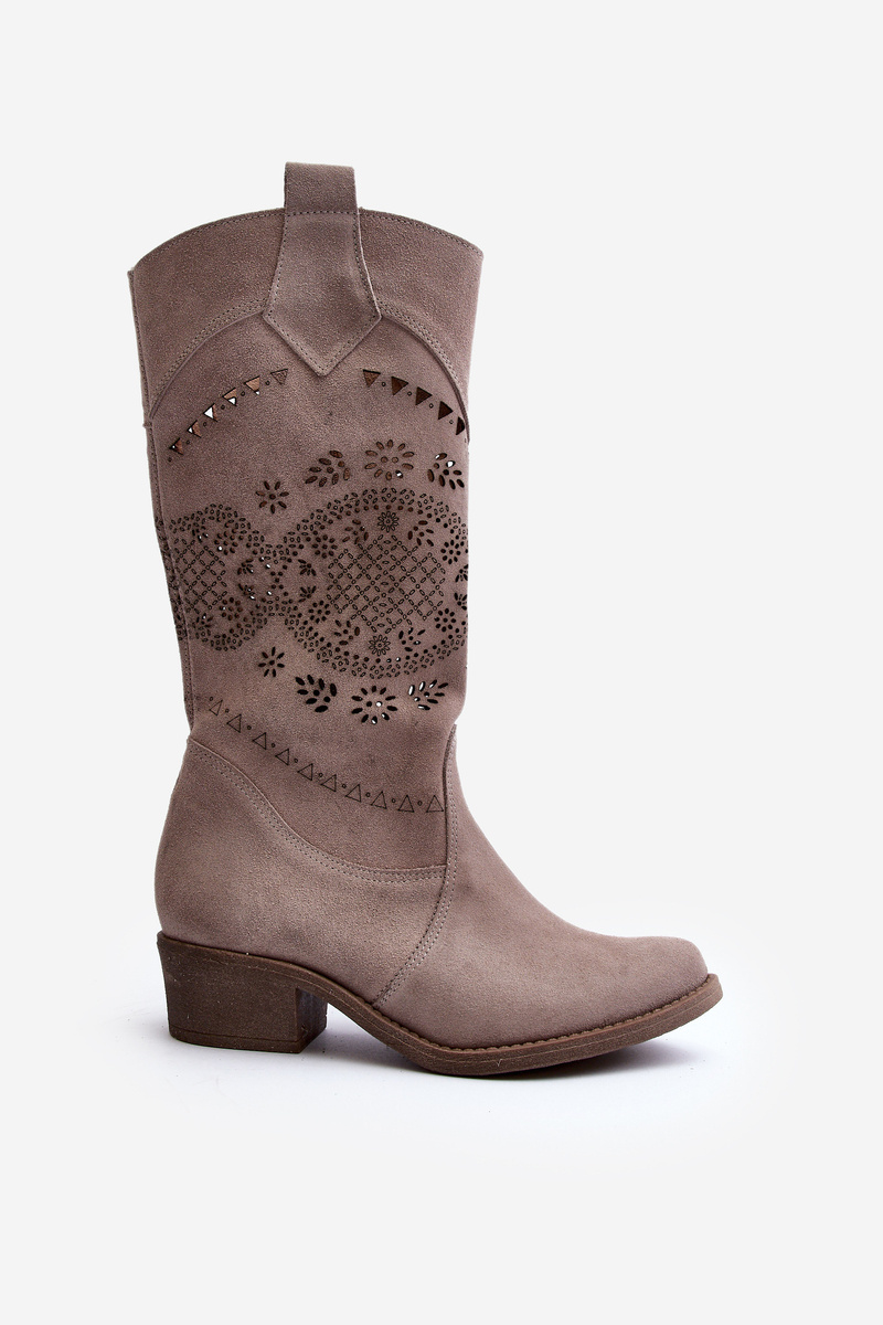 Dámské ažurové kozačky skvěle doplní jarní outfit. Vyrobené z přírodní semišové kůže. Nízký podpatek. Svršek po půlce lýtek je zapínán na zip. Špičaté nosky. Měkká stélka zajistí pohodlí během nošení. Při výběru velikosti se řiďte tabulkou velikostí.