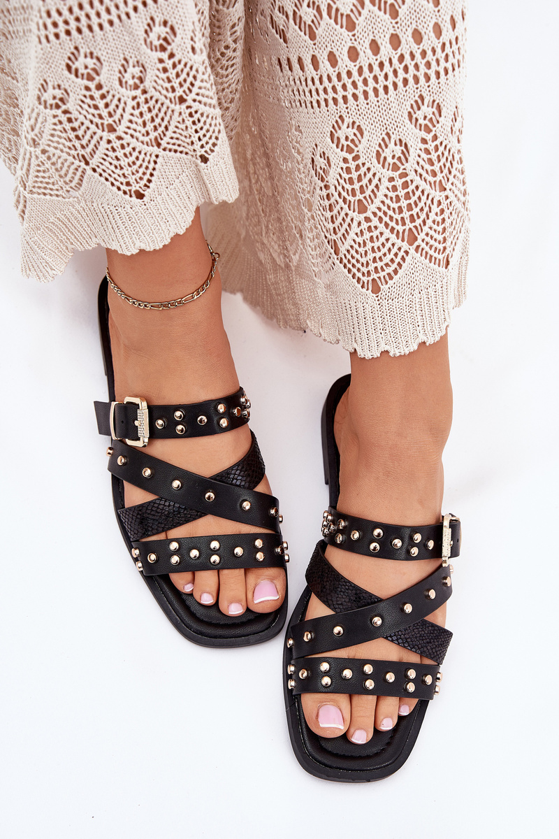Zdobené Dámské Pantofle Na Plochém Podpatku S Pásky A Přezkou Černé Manitte
