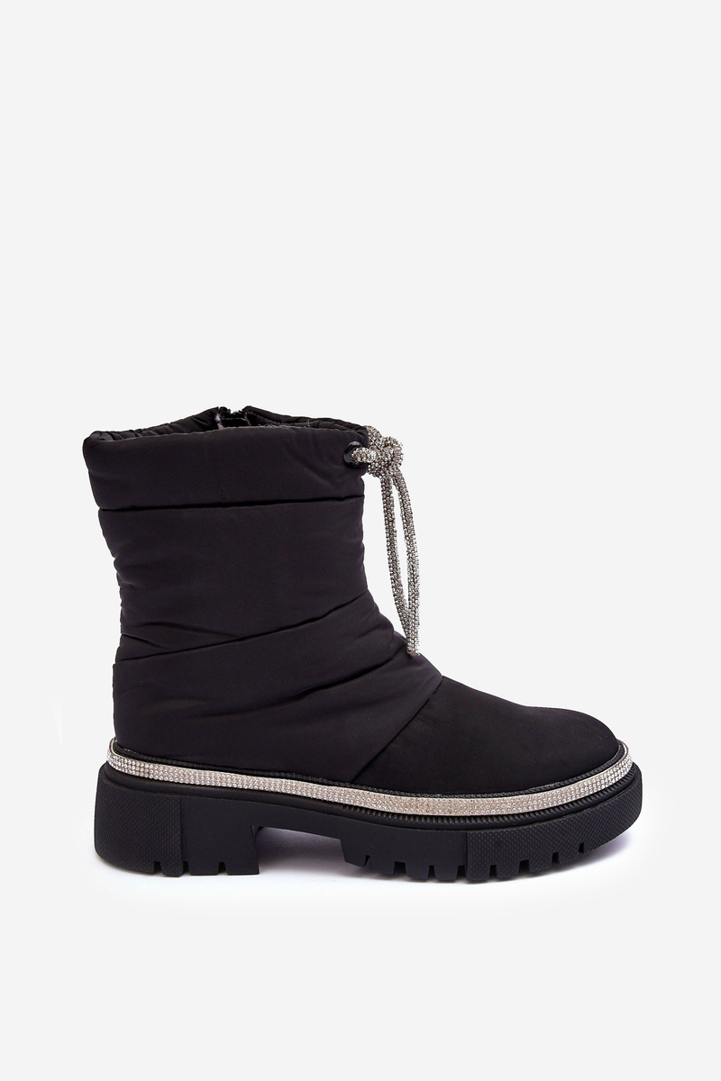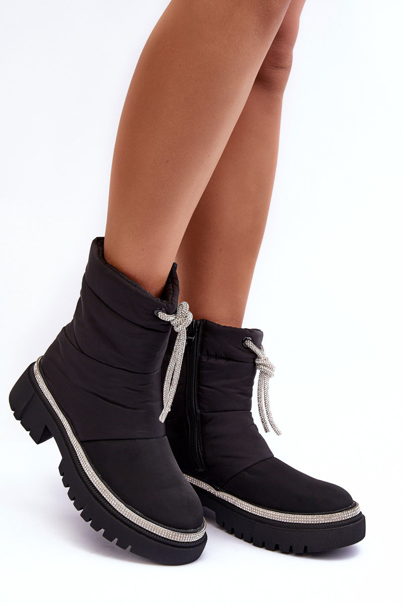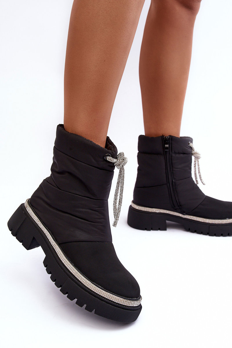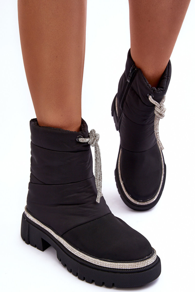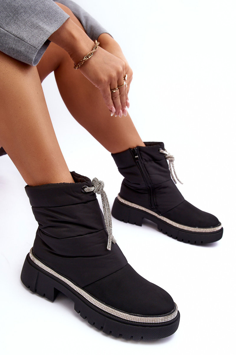 Dámské sněhové boty na plochém podpatku a platformě. Vyrobeno z textilního materiálu. Tento model je zateplen hrubou vlnou uvnitř. Zip na zip. Ozdobení malými lesklými kamínky. Navíc mají usnadněný zapínací prstenec. Při výběru velikosti se řiďte tabulkou velikostí.