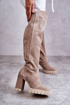 Dámske topánky na kolene po tmavej béžovej skutočne láske