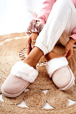 Dámska kožušina papaci s klobúkom a pompom ružová udržujte v teple