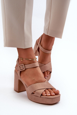 Dámske sandále z eko zamatovej kože na opätku a platforme v tmavobežovej farbe Sakane