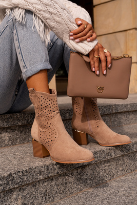 Ažúrové členkové topánky s blokovým opätkom vyrobené z ekokože zips tmavobežové Sevana
