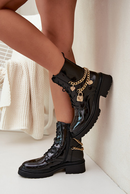 Lakované Botky Pracovné Dámske So Zlatým Reťazcom Zateplené Čierne Sarinae