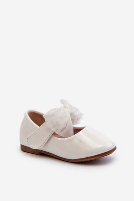 Biela Olessa lakované detské baletky na suchý zips s mašľou