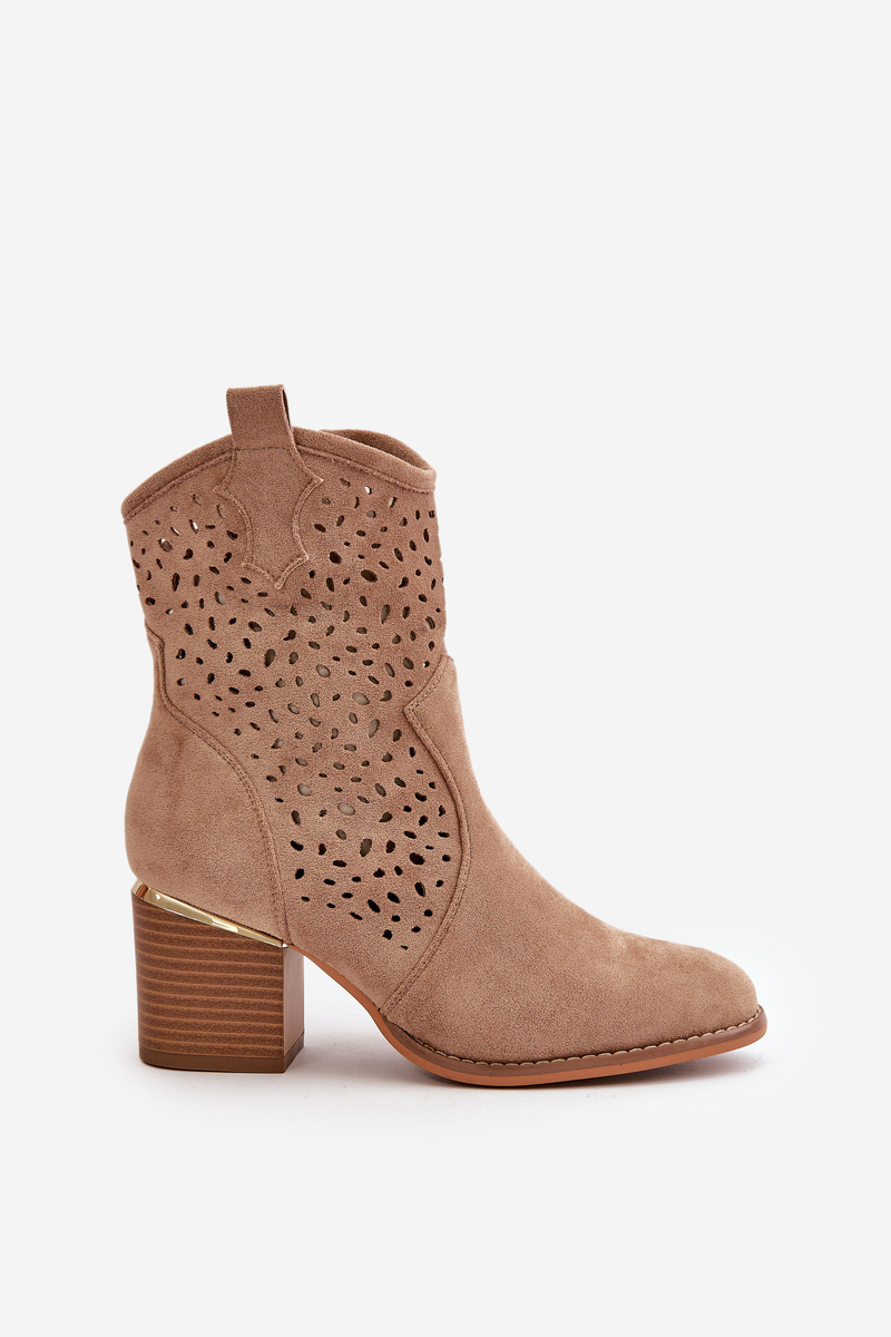 Ažúrové členkové topánky s blokovým opätkom vyrobené z ekokože zips tmavobežové Sevana