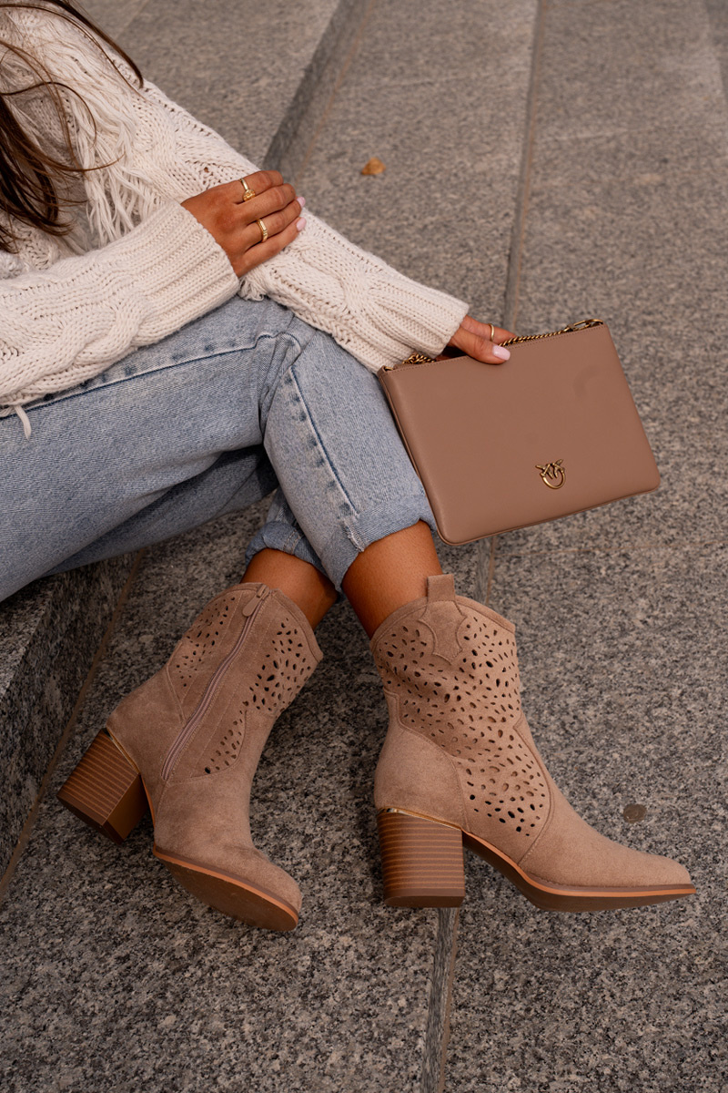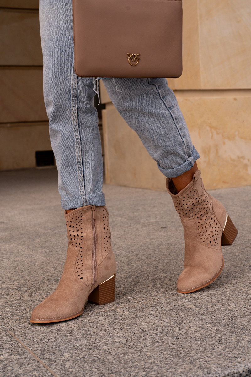 Dámske členkové topánky vyrobené z ekologickej semišovej kože, s ažúrovým vrchným dielom, ktorý siaha až za členok. Nastavené na elegantnom stĺpcovom opätku zdobenom zlatým prvkom, čo im dodáva jedinečný charakter. Zatvárajú sa na zips, čo zaisťuje pohodlnosť používania. Zaoblené špičky podčiarkujú ich klasický a štýlový vzhľad. Ideálne pre každodenné a elegantné štýly. Při výběru velikosti se řiďte tabulkou velikostí.