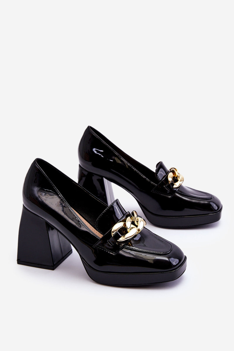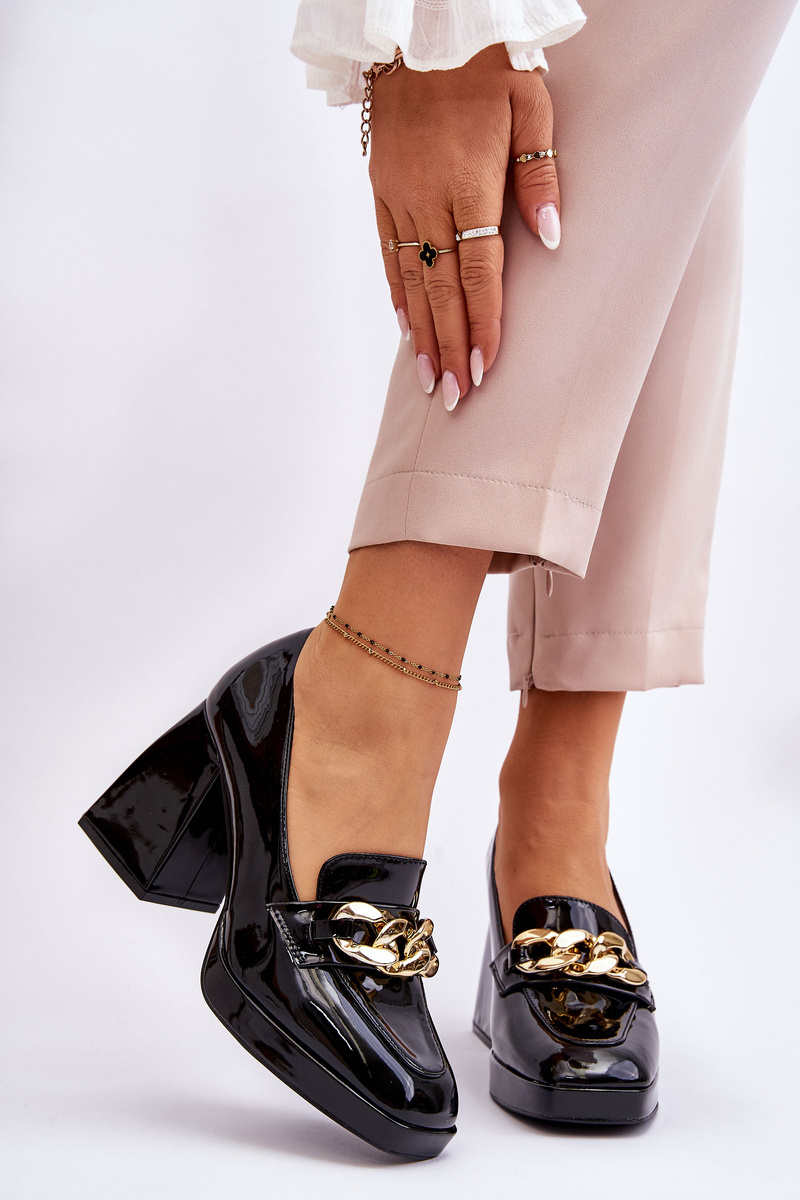 Eco Leather Pumps je ideálnou voľbou pre každú ženu, ktorá oceňuje módnu a pohodlnú obuv! Tieto čerpadlá majú dekoráciu reťazca. Boli zabudovaní na jemnú plošinu a masívnu vysokú podpätku vo forme bloku. Okrem toho majú stuhnutú pätu. Skvelý model pre mnoho štýlov! Pri výbere veľkosti navrhnite tabuľku veľkosti.