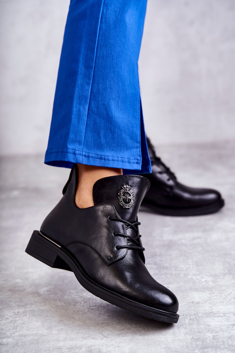 Dámske topánky s hornou ekologickou kožou a módnymi výrezmi. Topánky boli zdobené plastovým prvkom. Klasicky šnurovaný model. Tieto topánky boli umiestnené v plochej päte. Agent izolovaný obuvou prikrývkou bude chladné dni už tak strašidelné! Tento model by mal byť váš! Pri výbere veľkosti navrhnite tabuľku veľkosti.