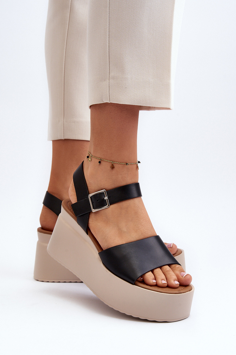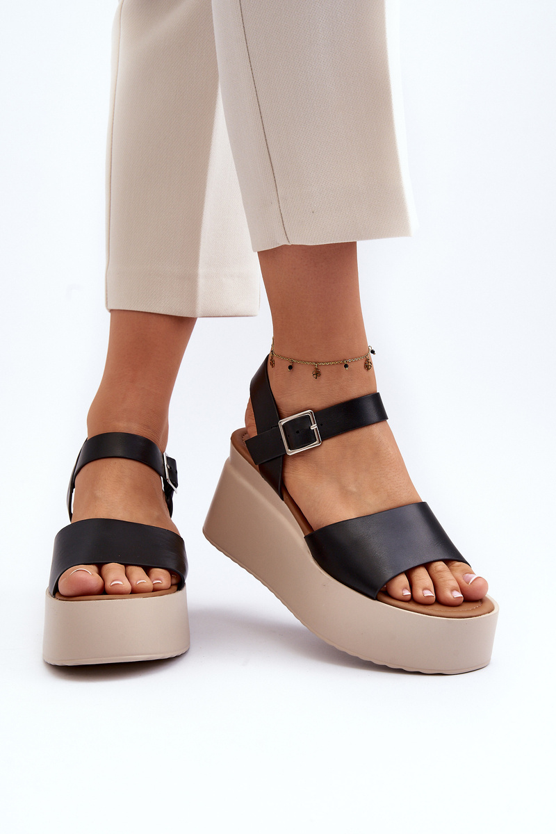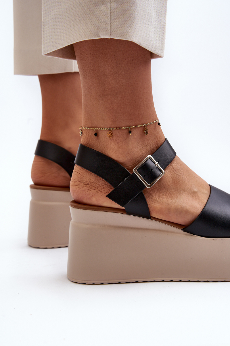 Dámske sandále vyrobené z eko kože. Vsadené na klinu a platforme, čo im nielenže dodáva módnym vzhľad, ale tiež poskytuje stabilitu počas chôdze. Zapínajú sa na nastaviteľný popruh so sponou, ľahko ich prispôsobíte svojej nohe. Při výběru velikosti se řiďte tabulkou velikostí.