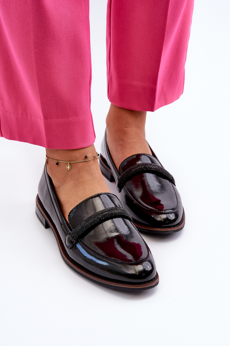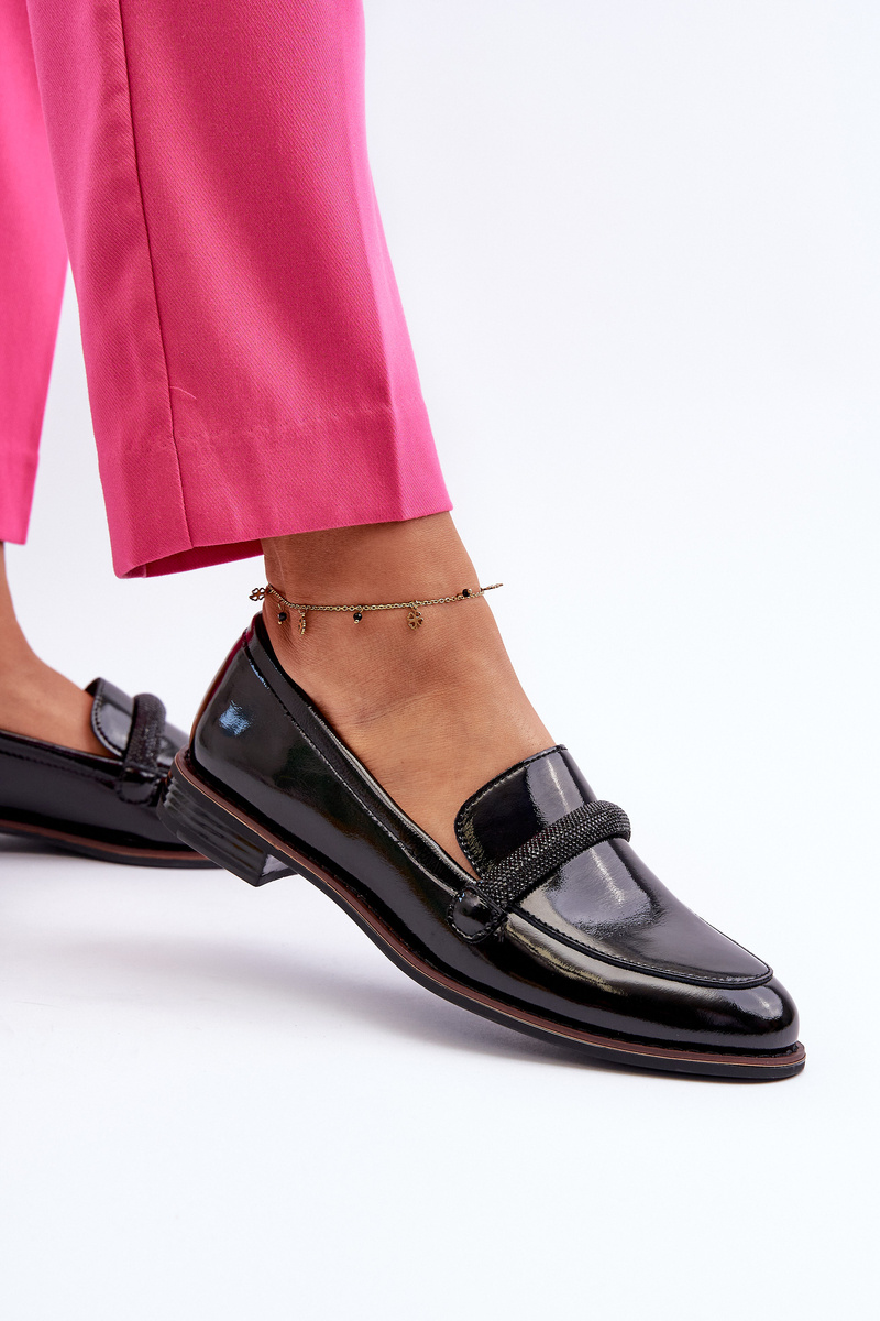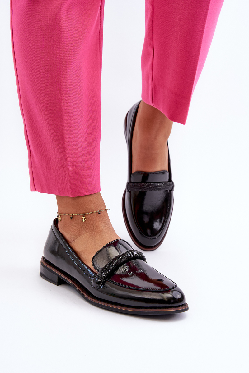 Čierne lakované kožené dámske mokasíny s ozdobným pásikom Saosin