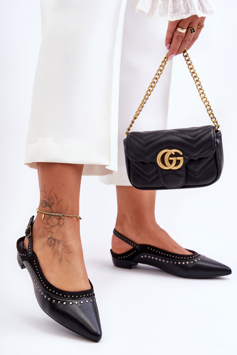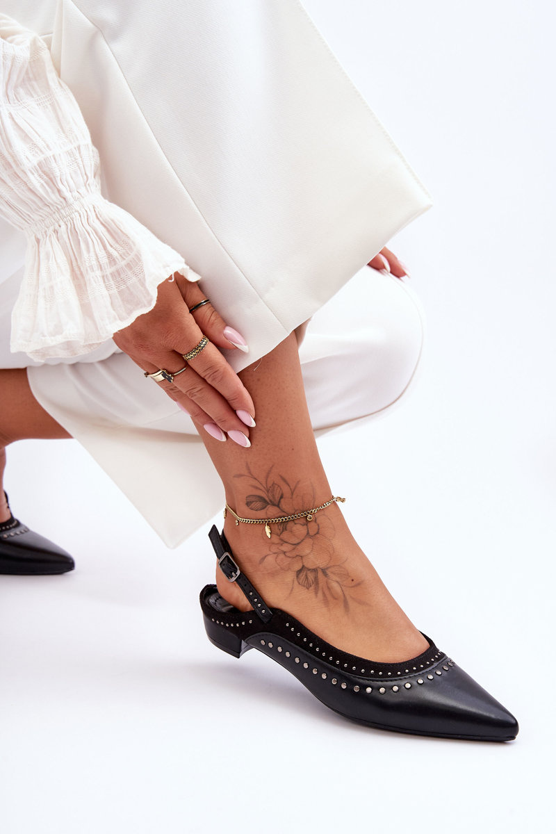 Dámske baleríny majú v Spitz otvorenú pätu a módny nos. Boli vyrobené z ekologickej kože a vyzdobené cvočkami. Majú upevnenie na nastaviteľnom pásme s prackou. Mäkká ekologická kožená vložka poskytne pohodlie počas používania. Pri výbere veľkosti majú baleríny plochú pätu. 25,5/41-26 cm