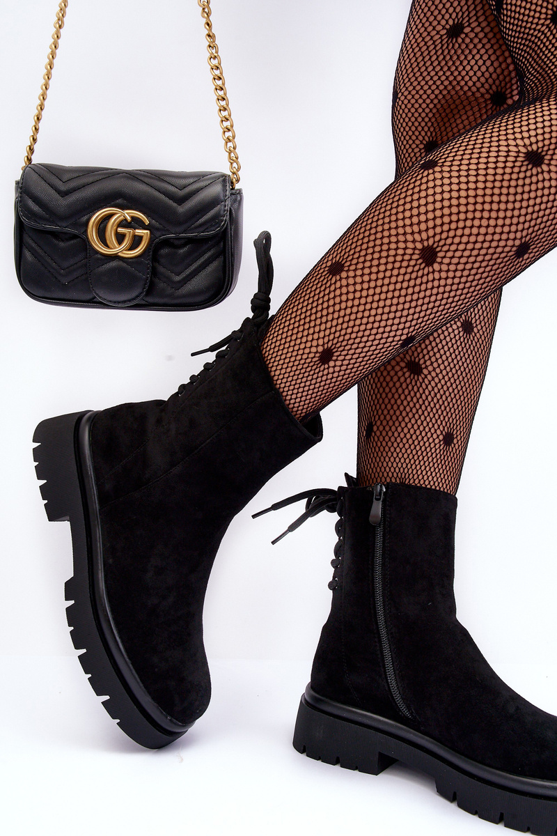 Dámske topánky vyrobené z ekologického semišu. Nastavené na plochú, stabilnú pätu a platformu. Interiér izolovaný prikrývkou obuvi. Zaoblené prsty na nohách. Horná časť zdobená zadnou šnurovaním. Tento model je pripevnený posúvačom. Ideálne pre jesenné a zimné štylizácie! Pri výbere veľkosti navrhnite tabuľku veľkosti.