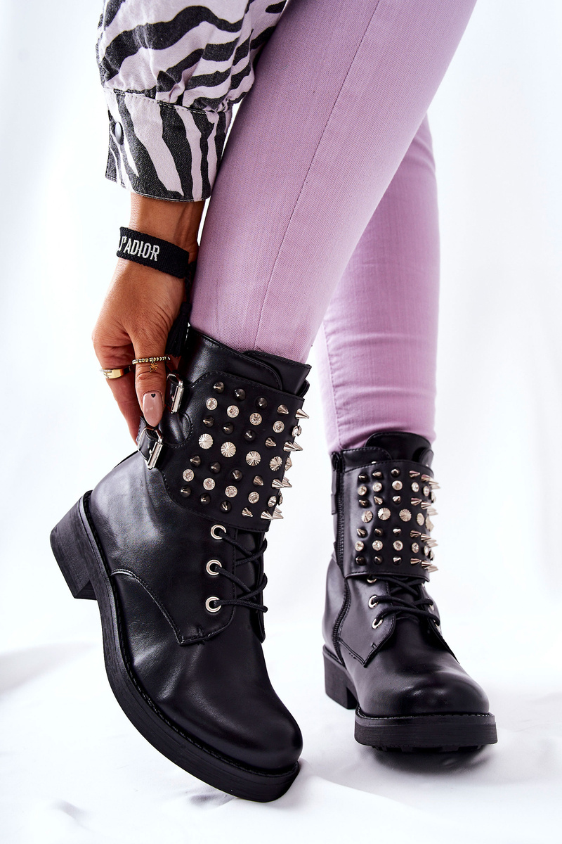 Vysoké topánky vyrobené z ekologickej kože. Majú posúvač na boku, aby uľahčil inštaláciu obuvi. Dekoratívne cvočky a kamienky. Upevnenie prackami zdôrazňuje jedinečnosť tejto obuvi. Majú tiež väzbu. Plochá päta zaisťuje stabilitu v každom kroku. Pozrite sa na ďalšie topánky! Pri výbere veľkosti navrhnite tabuľku veľkosti.