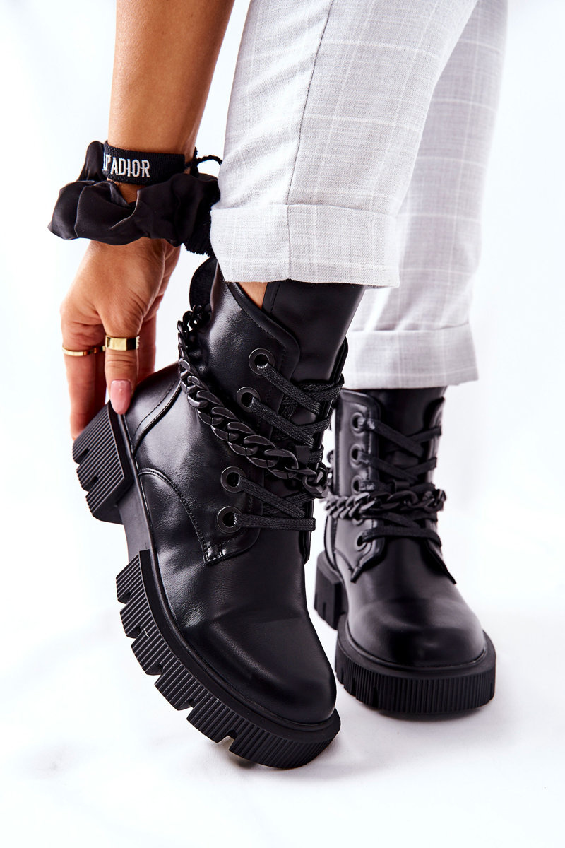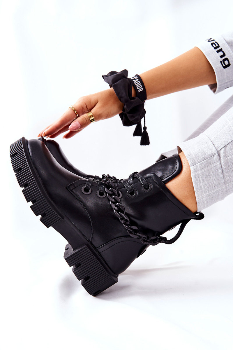 Boots sú nevyhnutnosťou pre každú ženu! Izzy pracovníci sú vyrobení z ekologickej kože. Majú dekoratívnu reťaz. Sú pripevnené posúvačom a majú väzbu, vďaka čomu ich môžeme správne porovnávať. Vďaka masívnej podrážke sa v nich cítite stabilný. Pri výbere veľkosti navrhnite tabuľku veľkosti.