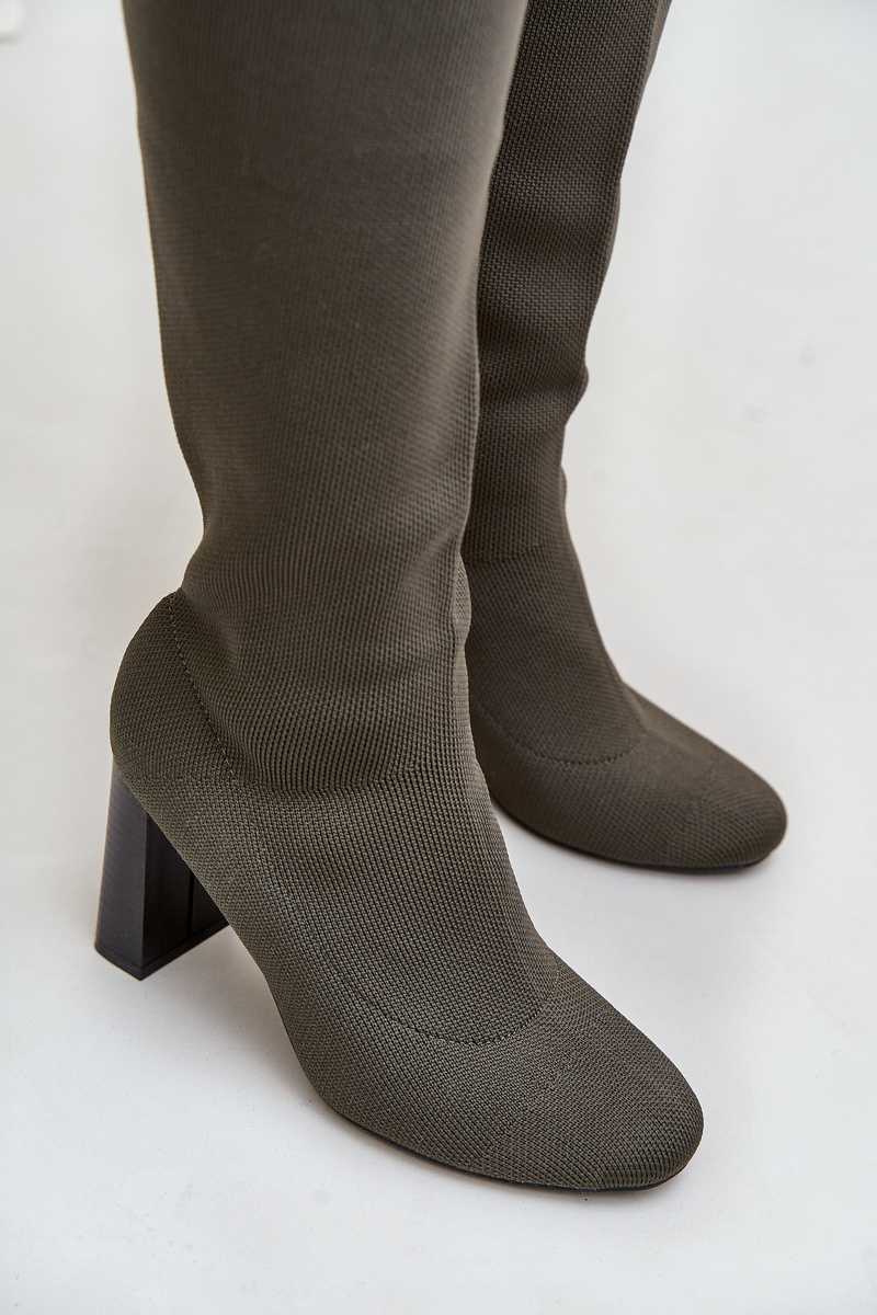 Dámske čižmy s efektnou, nad koleno siahajúcou, ponožkovou časťou. Model je umiestnený na stabilnom blokovom opätku, ktorý dodáva eleganciu a predlžuje siluetu. Zaoblené špičky zabezpečujú pohodlie pri nosení. Vnútro je zateplené iba na úrovni chodidla. Toto je štýlové a módne riešenie, ktoré sa ideálne hodí k šatám a sukniam! Při výběru velikosti se řiďte tabulkou velikostí.