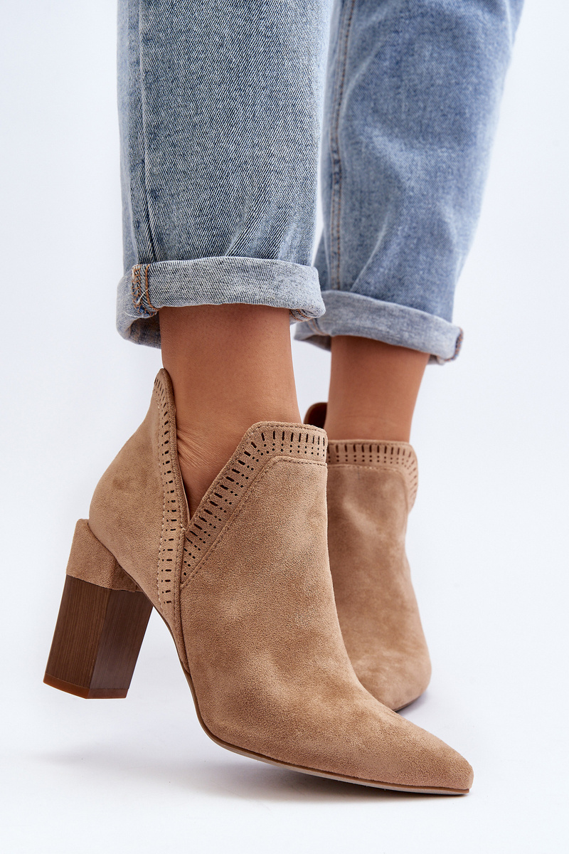 Dámske členkové topánky vyrobené z eko semišu. Vsadené na podpätku v tvare stĺpika. Špičaté špičky opticky zjemnia nohy. Zvršok zdobený ažúrovým vzorom. Zapínajú sa na zips po bokoch. Určite ich využijete k mnohým jarným štýlizáciám! Při výběru velikosti se řiďte tabulkou velikostí.