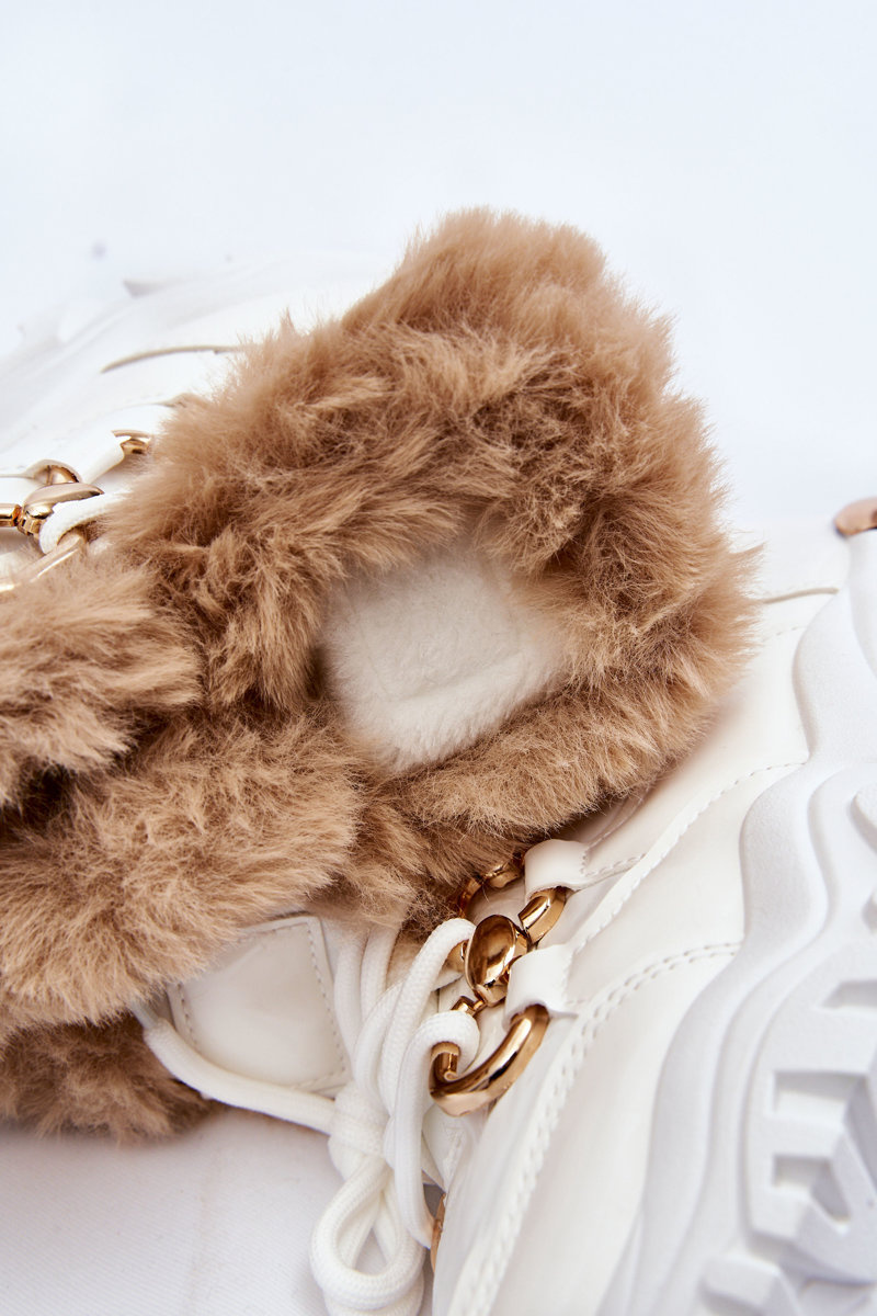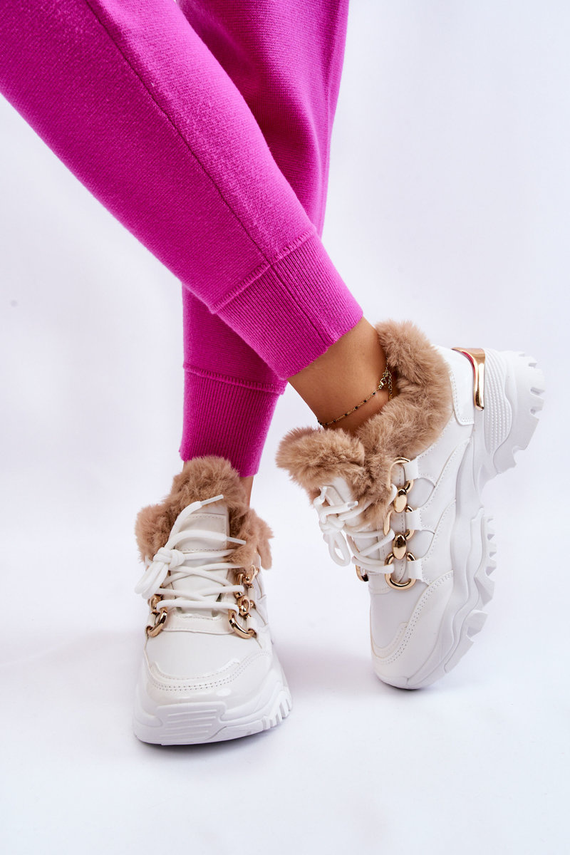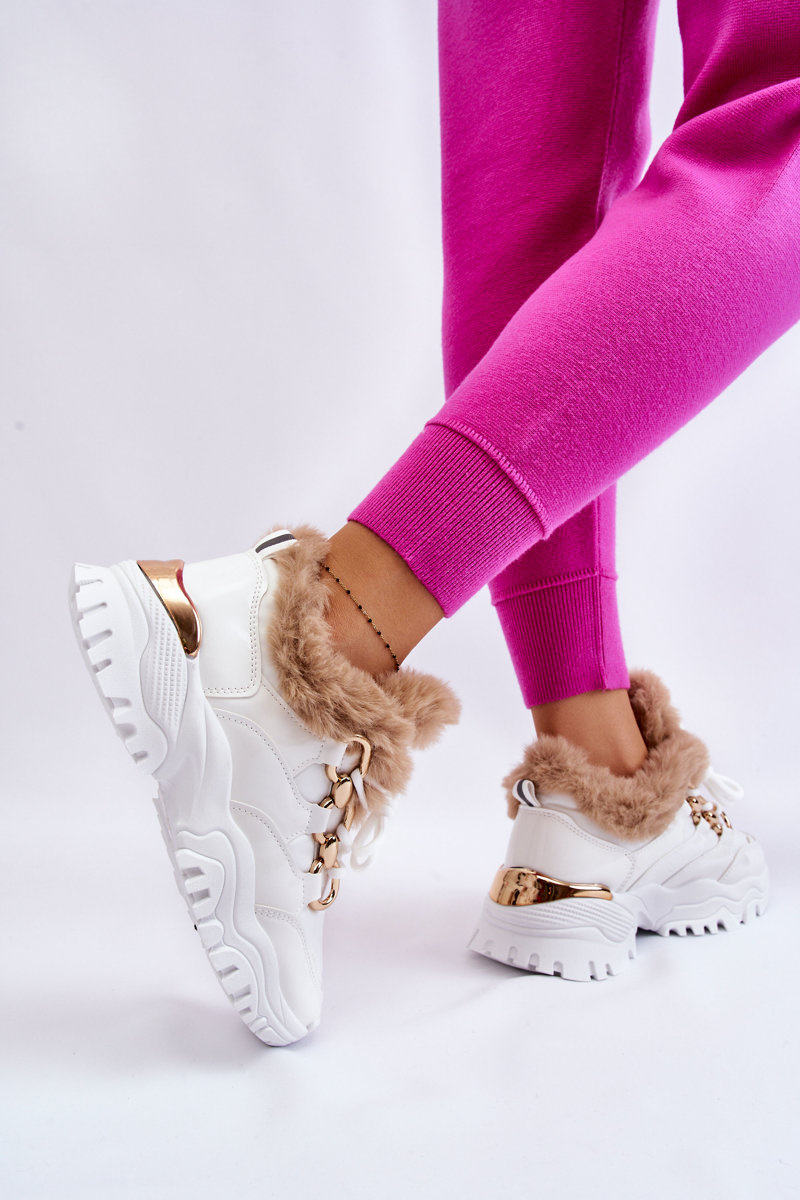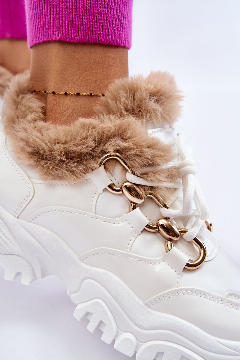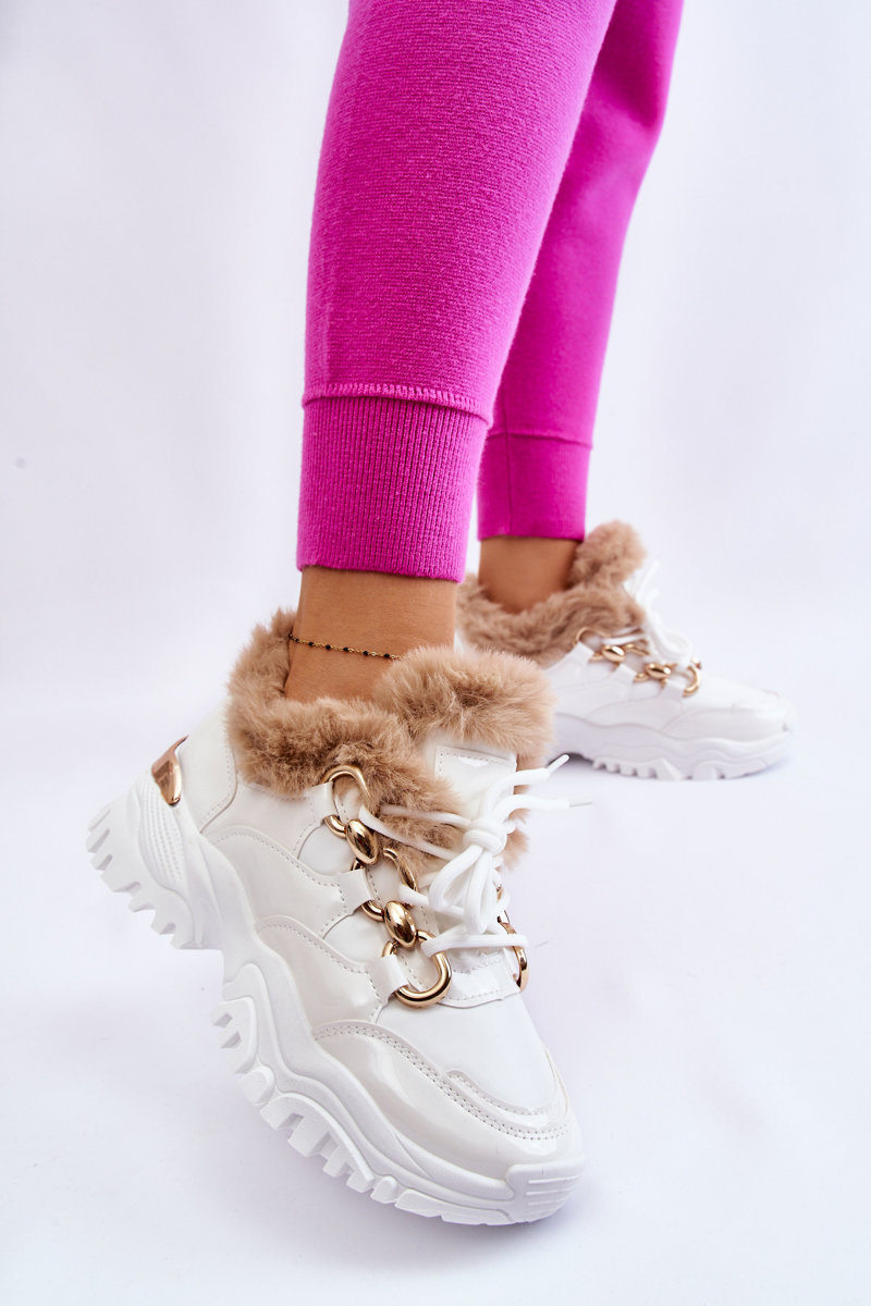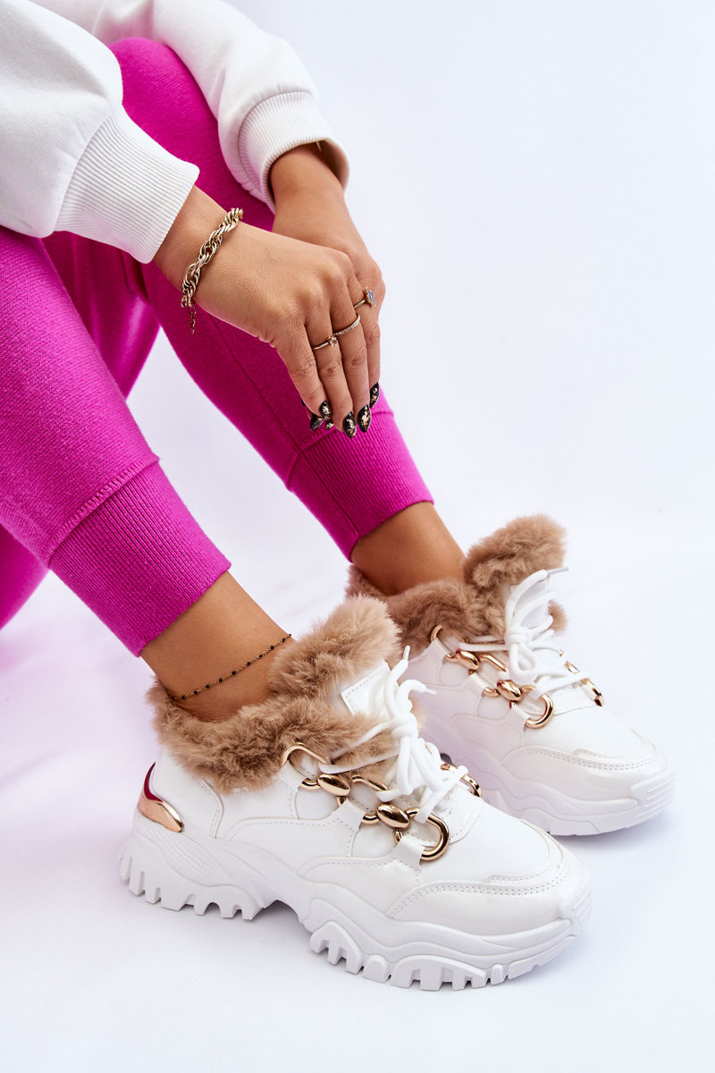 Izolované topánky sú ideálnou voľbou pre jesenné a zimné dni. Majú peknú kožušinu. Tento model bol vyrobený z kombinácie ekologickej kože a plastu. Tento módny strih izolovaných športových topánok bol zabudovaný na plochú pätu a masívnu plošinu s drážkami. Pri výbere veľkosti navrhnite tabuľku veľkosti.