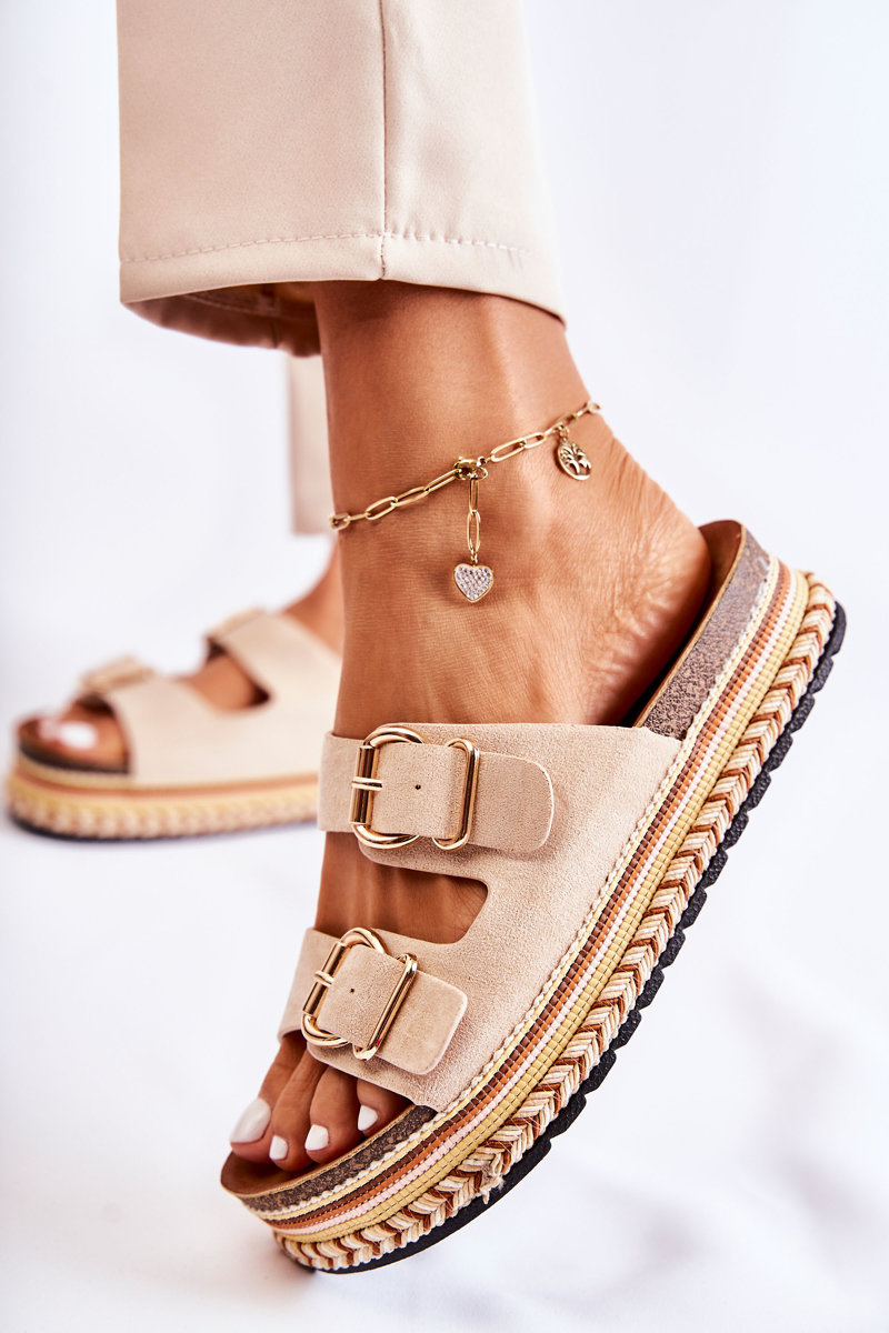 Perfektné žabky na letné prechádzky a denné nakupovanie. Tieto klapky majú dva široké prúžky pripevnené do sponky, ktorú je možné nastaviť. Pohodlie a pohodlie použitia zaručené, vďaka profilovanej vložke vyrobenej z ekologického semišu. Platforma je vyrobená z ľahkého plastu, ktorý je dodatočne zdobený vrkočou. Vďaka týmto klapkám je vaše nohy spočívajúce a uvoľnené. Pri výbere veľkosti navrhnite tabuľku veľkosti.