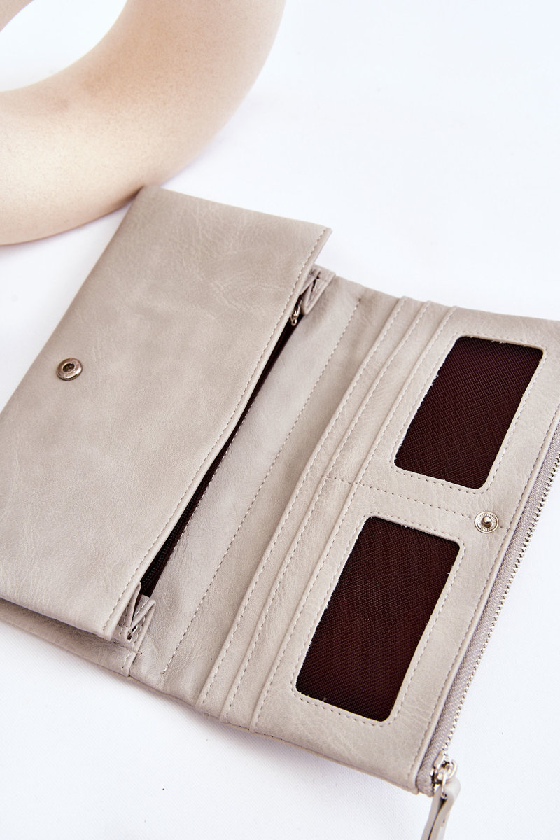 Veľká dámska peňaženka pripevnená lisom a zipsom. Bola vyrobená z ekologickej kože. Vo vnútri sú otvorené komory a jedna uzavretá zipsom. Peňaženka okrem toho obsahuje aj veľa miest pre vizitky alebo kreditné karty. Vonku je tiež ďalšie vrecko uzavreté zipsom a ďalšou komorou pripevnenou práškom. Táto peňaženka bude umiestnená najuznávanejšie veci, napríklad: dokumenty alebo peniaze.