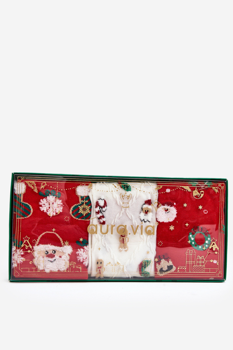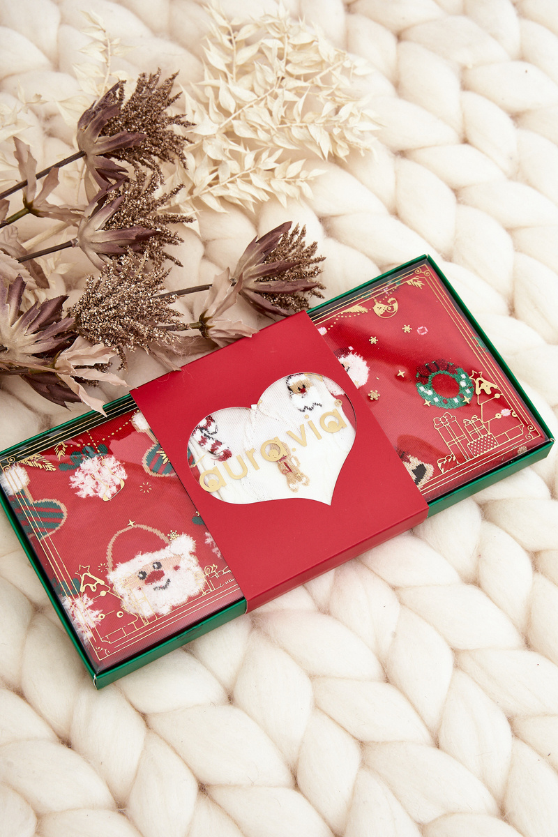 Veľká sada troch párov dámskych ponožiek v slávnostných dizajnoch. Perfektný vianočný darček pre všetkých! Vyrobené z vysoko kvalitnej bavlny. Majú chúlostivý zverenie, ktoré sa správne prispôsobuje úseku nohy.
