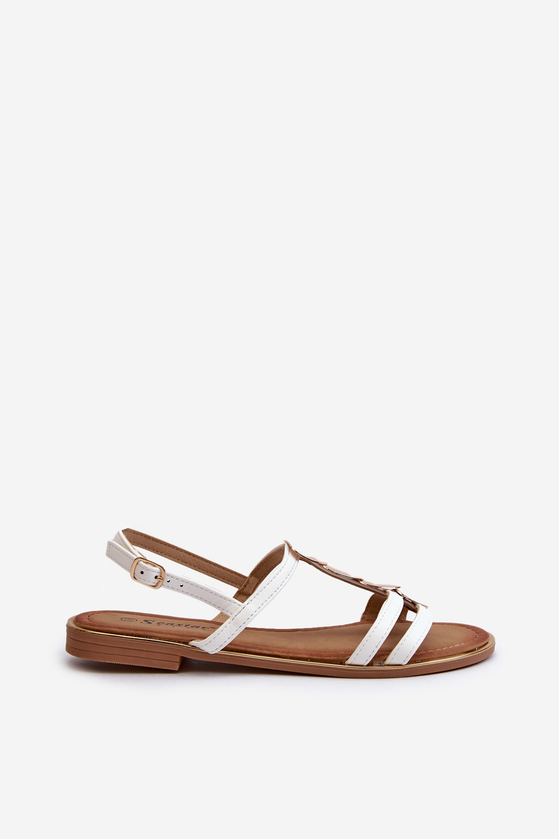 Ploché sandále vyrobené z ekokože, zapínané na nastaviteľný popruh s pripevnením. Predná časť je zdobená štýlovými detailmi, ktoré im dodávajú jedinečný šarm. Ideálne na každodenné nosenie, k mnohým rôznym štýlom! Při výběru velikosti se řiďte tabulkou velikostí.