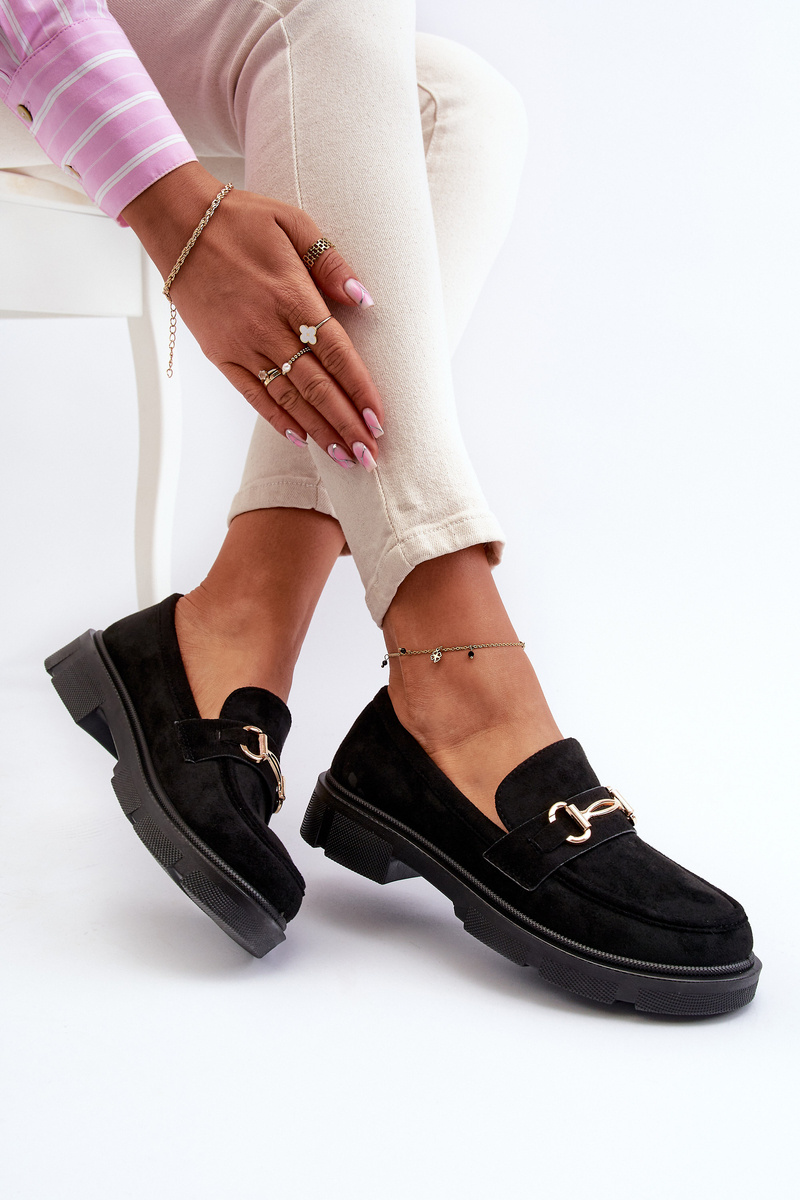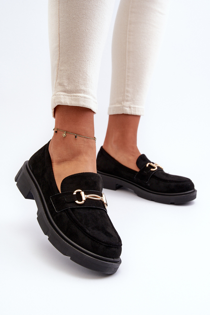 Dámske čierne mokasíny z eko-zamšu so zlatým ozdobou Lighas