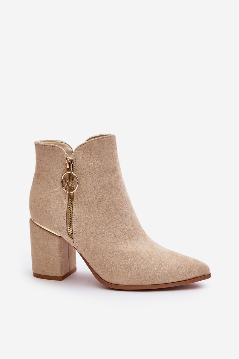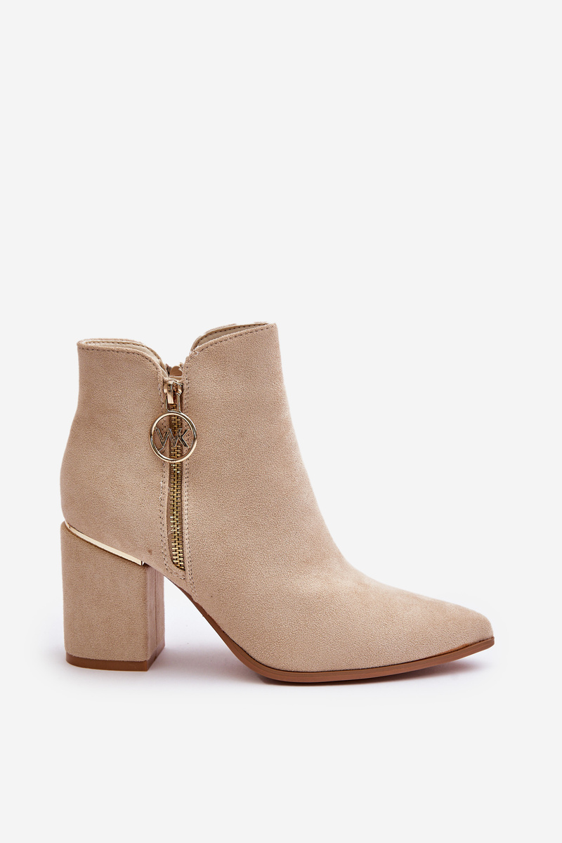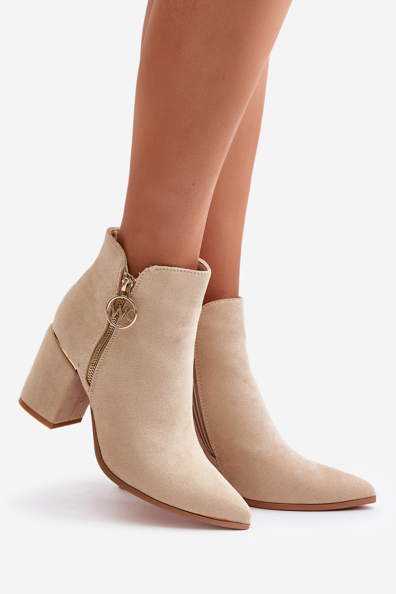 Elegantné členkové topánky z eko semišu, umiestnené na blokovom podpätku, sa vyznačujú špičatými prstami, ktoré im dodávajú štýl. Interiér je zateplený, čo zabezpečuje komfort v chladnejších dňoch. Zapínajú sa na zips na boku, navyše sú ozdobené zlatým zipsom, čo pridáva jedinečný štýl. Při výběru velikosti se řiďte tabulkou velikostí.
