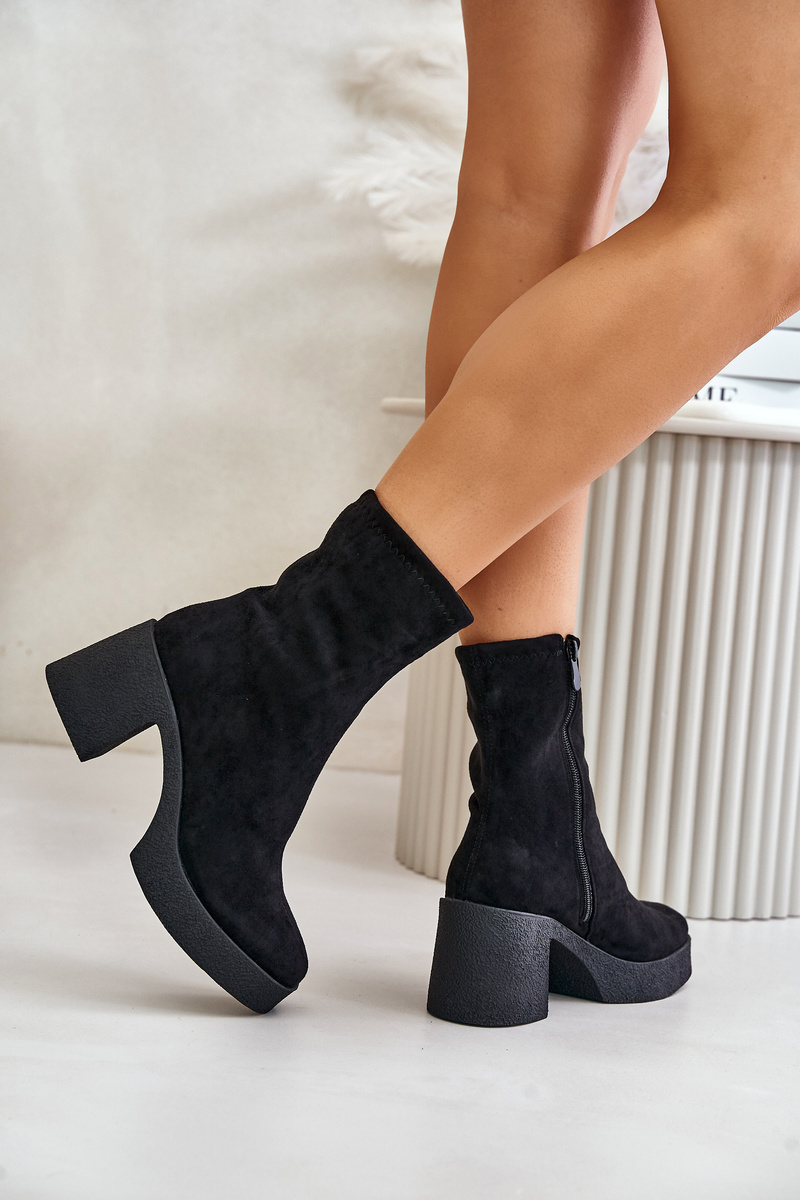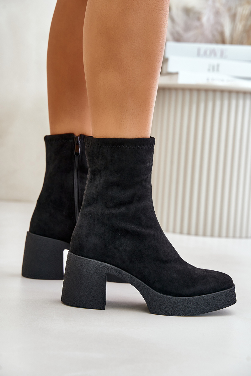 Dámske čižmy vyrobené z eko kože. Uložené na masívnom blokovom podpätku a platforme. Zaoblené špičky. Zapínanie na zips. Mäkká stielka zabezpečuje pohodlné nosenie. Ideálne na styling s šatami a sukňami. Při výběru velikosti se řiďte tabulkou velikostí.