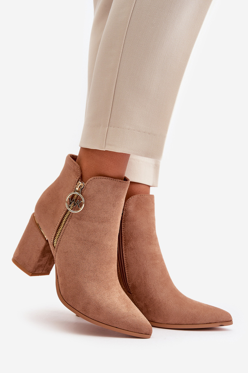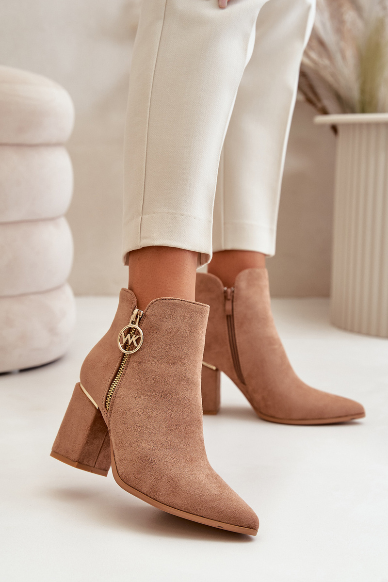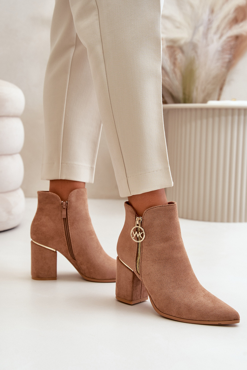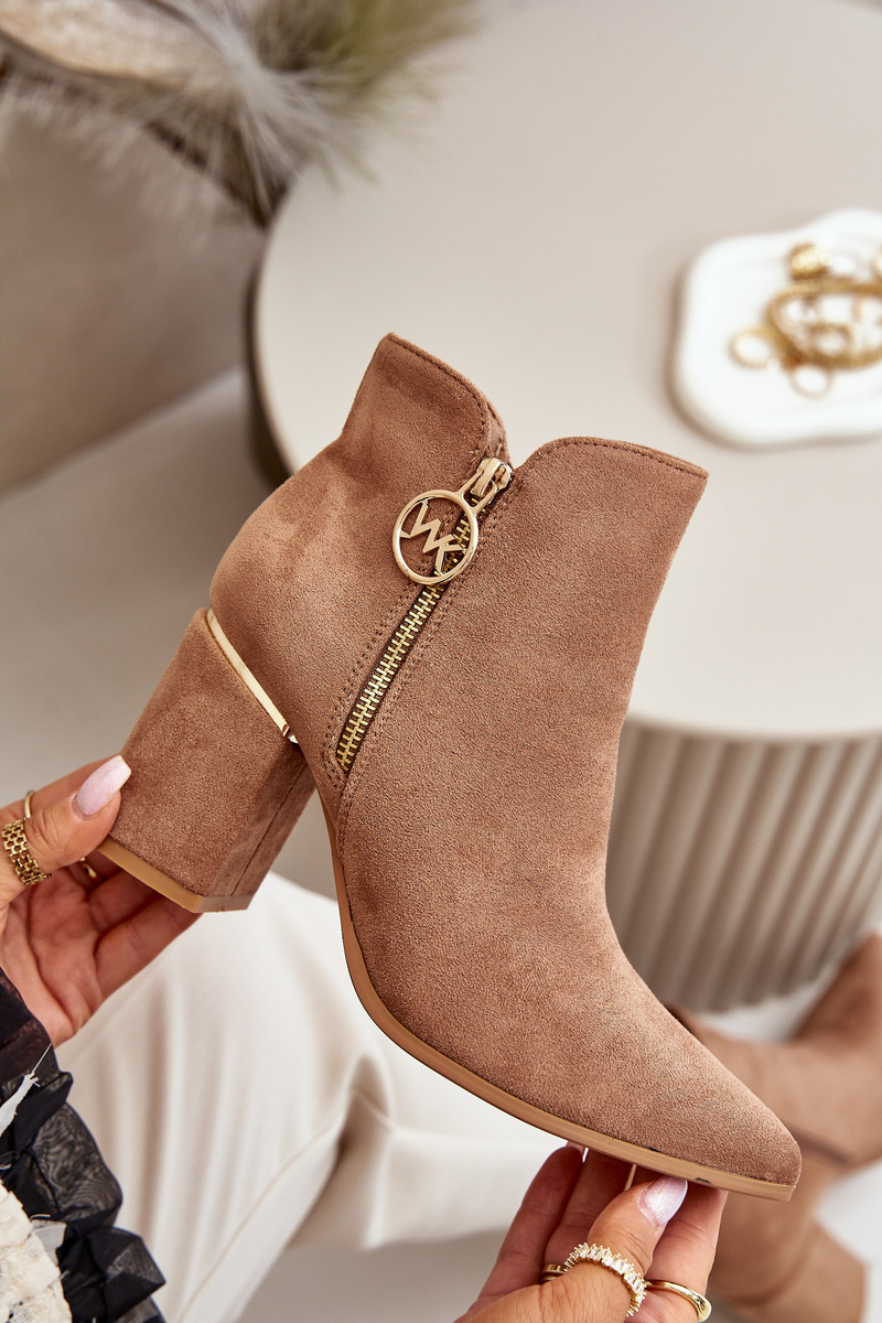 Elegantné členkové topánky z eko semišu, umiestnené na blokovom podpätku, sa vyznačujú špičatými prstami, ktoré im dodávajú štýl. Interiér je zateplený, čo zabezpečuje komfort v chladnejších dňoch. Zapínajú sa na zips na boku, navyše sú ozdobené zlatým zipsom, čo pridáva jedinečný štýl. Při výběru velikosti se řiďte tabulkou velikostí.