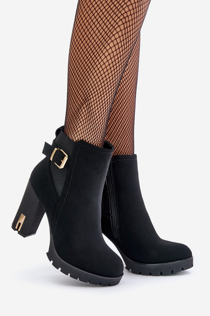 Elegantné kotníkové topánky vyrobené z eko kože. Uložené na vysokom blokovom opätku. Interiér je zateplen jemným obuvníckym kobercom, čo zaručuje teplo a pohodlie v chladných dňoch. Zaoblené špičky im dodávajú klasický pôvab a pásik s efektnou zlatou sponou na svršku pridáva sofistikovaný štýl. Tento model by určite mal byť súčasťou vašej jesennej a zimnej garderóby! Při výběru velikosti se řiďte tabulkou velikostí.