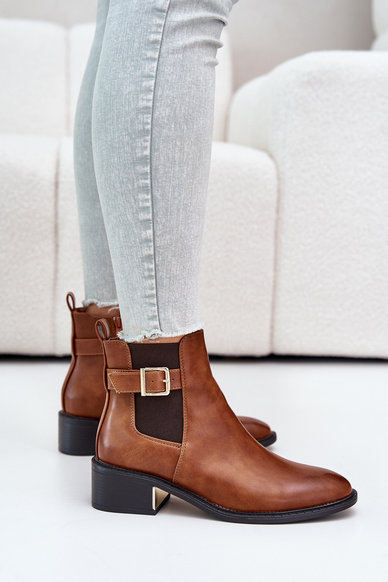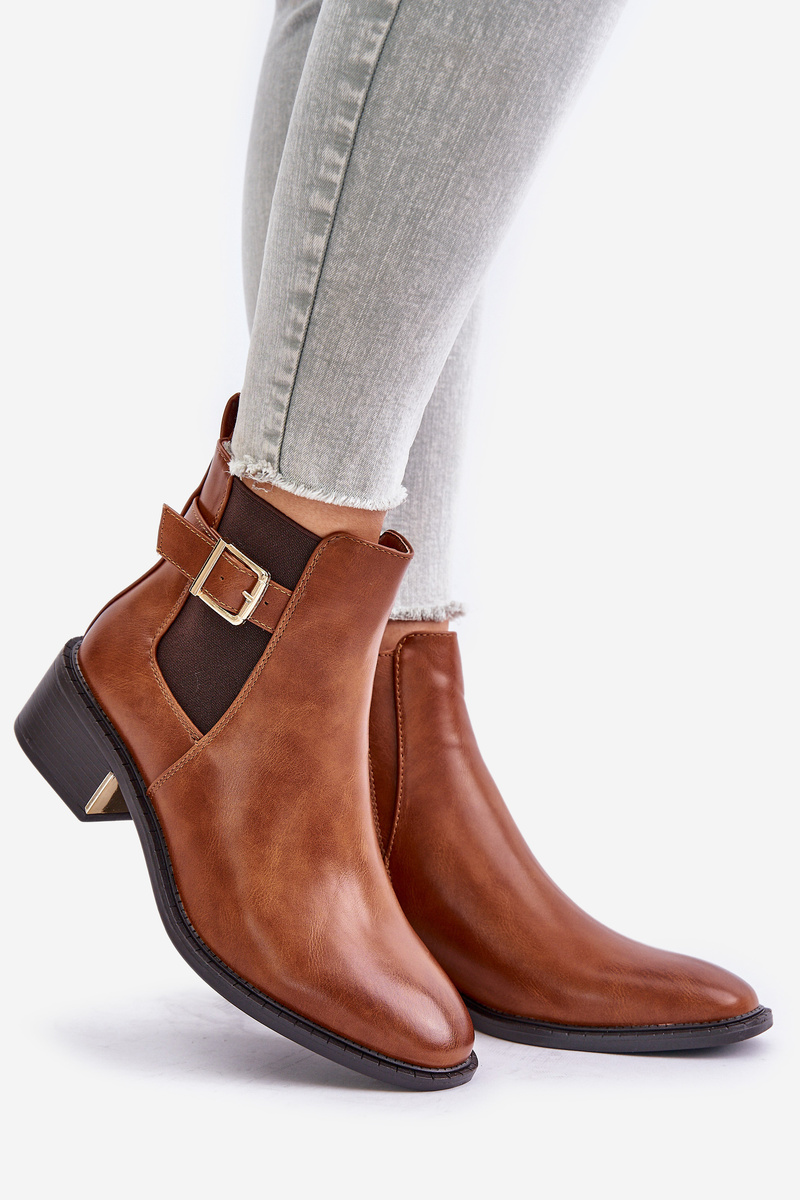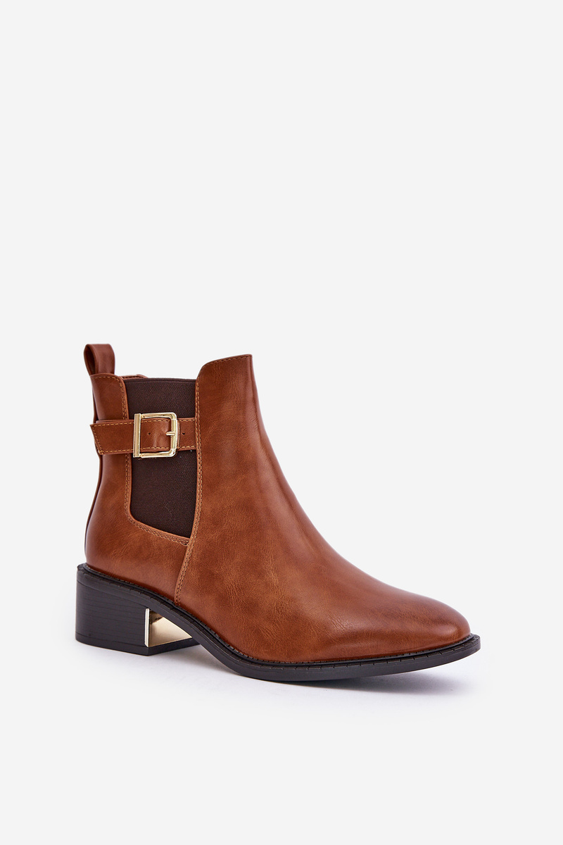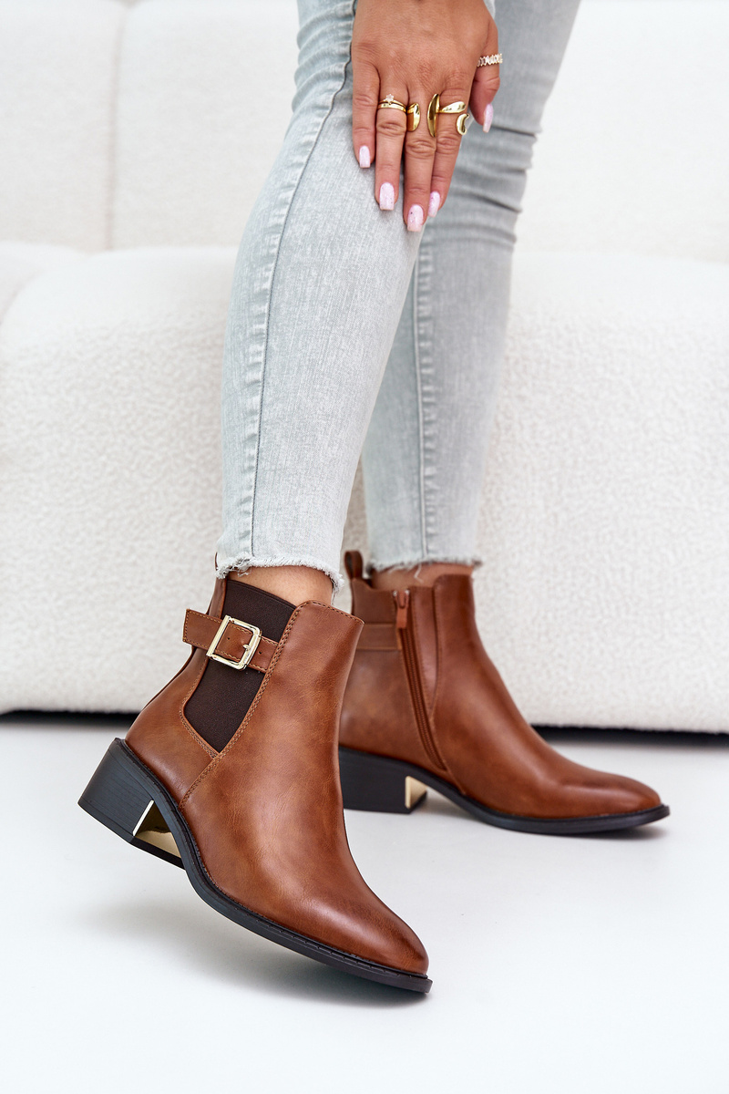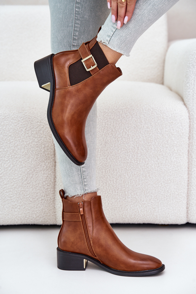 Towar wprowadzony przed 13.12.2024Tak Dámske členkové topánky na nízkom podpätku so zlatou prackouCamel Vomera