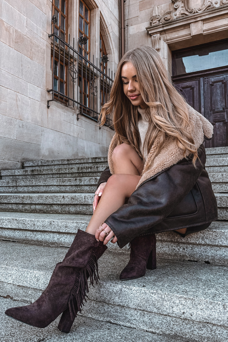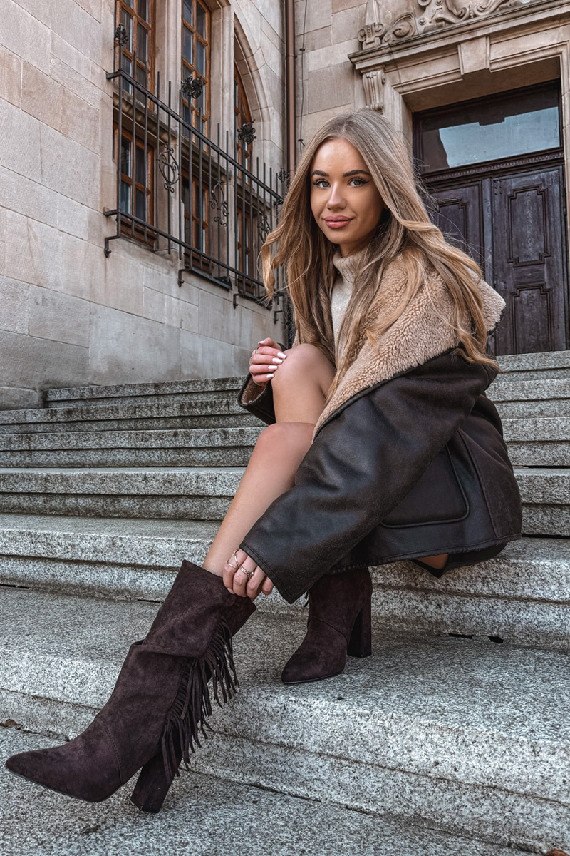 Dámske členkové topánky vyrobené z mäkkej ekologickej semiše. Model na stabilnom opätku typu stĺpik a s úzkymi špičkami krásne predĺži nohy a pridáva siluete ľahkosť. Rázovitá vyšší časť a ozdobné strapce dodávajú celku jedinečný, štýlový charakter. Topánky sa zapínajú na zips, čo uľahčuje ich obúvanie. Vnútro s teplým podšívkou zabezpečuje teplo a pohodlie v chladnejších dňoch. Ideálna voľba pre ženy, ktoré radi kombinujú pohodlie s trochou boho elegancie — výborne sa hodia k nohaviciam aj šatám.