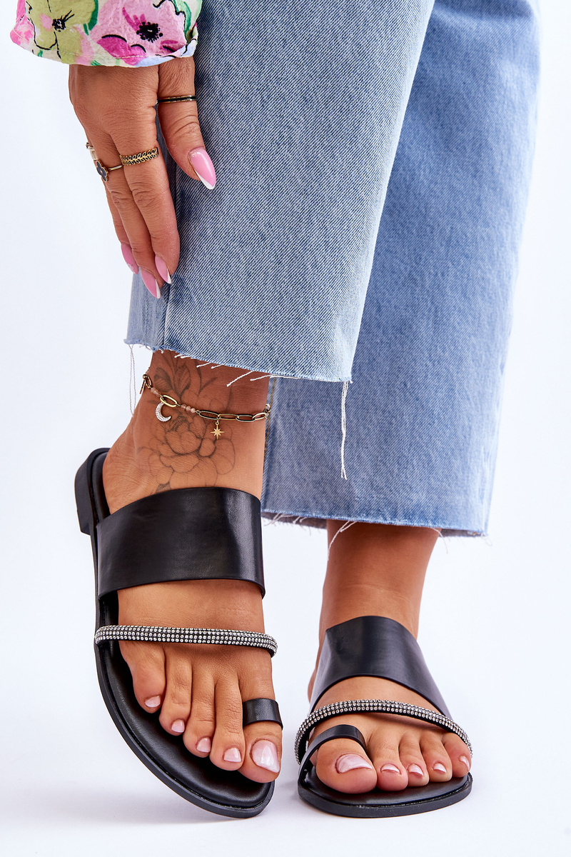 Klasické žabky boli vyrobené z ekologickej kože. Majú dekoratívny remienok s trblietavými kamienkami napodobňujúcimi kamienky. Ploché -zakorenené plastovou podrážkou. Tento model je vynikajúci pre mnoho letných štylizovaní. Flip -flops majú mäkkú ekologickú vložku.