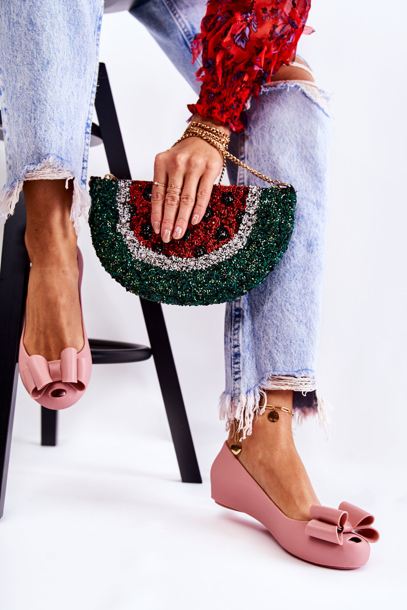 Unikátne baleríny s dekoratívnym lukom na prednej strane. Okrem toho je na zaoblenom nose jemný rez. Topánky boli vyrobené z gumového plastu. Baleríny sú vložené na plochú pätu s podrážkou. Mäkká vložka poskytne pohodlie počas používania. Na strane hornej časti je dekoratívny prvok. Tieto baleríny sú skvelé pre rôzne typy osláv. Pri výbere veľkosti navrhnite tabuľku veľkosti. p>