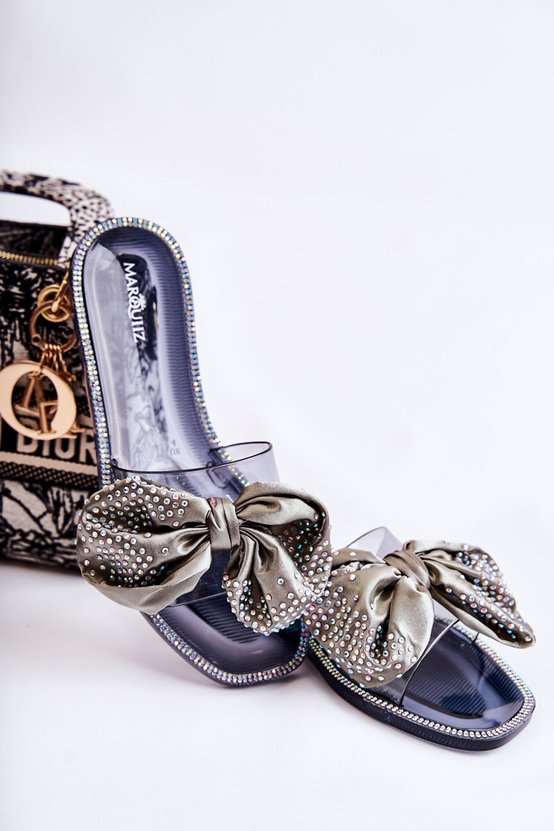 Unikátne dámske papuče s dekoratívnymi prvkami. Luk na prednej strane bol vyrobený z textilného materiálu s doplnkami vo forme zirkónie. Papuče vyrobené z gumového plastu. Objavený nos, mierne štvorcový. Vstavané na plochej podrážke. Vložka je zdobená trblietavými zirkónmi. Pevný model, ideálny pre letné dni! Pri výbere veľkosti navrhnite tabuľku veľkosti. /p>