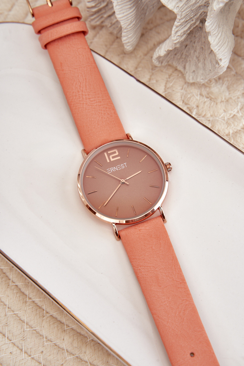 Ernest Watch je model pre ženy, ktoré si cenia elegantný a jemný dizajn. Hodinky majú ekologický kožený remienok. Celý vyzerá veľmi jemne a žensky. Pripevnené prackou. Veľký, viditeľný štít vyzerá skvele na vašich rukách.