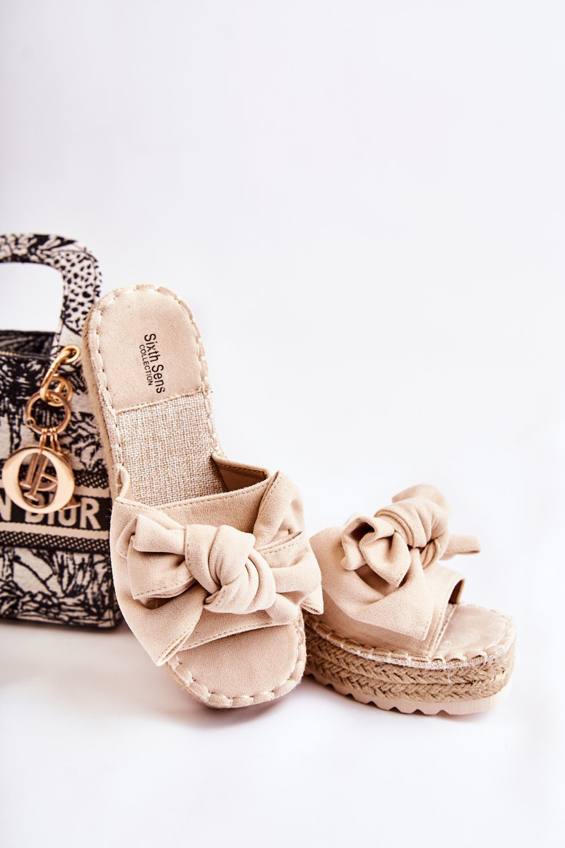 Pohodlné žabky z vysokokvalitného ekologického semišu. Vložka je vyrobená z kombinácie ekologického semišu a látky. Topánky zabudované na plošine s Koturou. Okrem toho zdobené jutou. Na prednej tyči je očarujúci luk. Plastová podrážka. Perfektný model každý deň. Mali by ste to mať! Pri výbere veľkosti navrhnite tabuľku veľkosti.