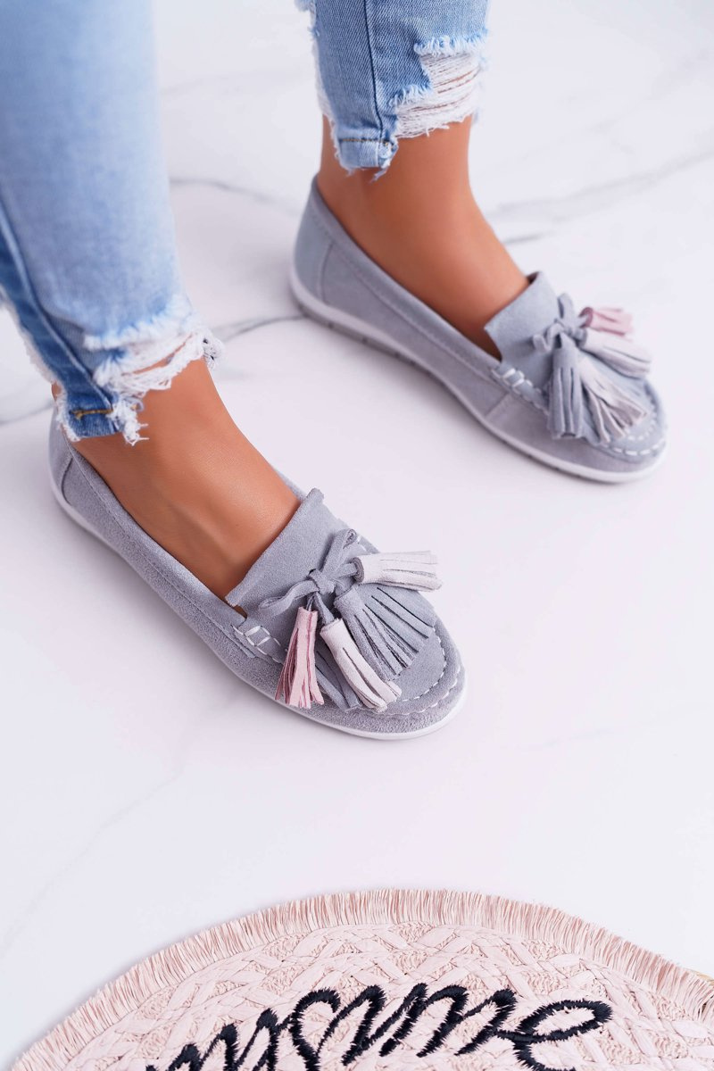 Dámske kožené mokasíny so sivými batistovými strapcami